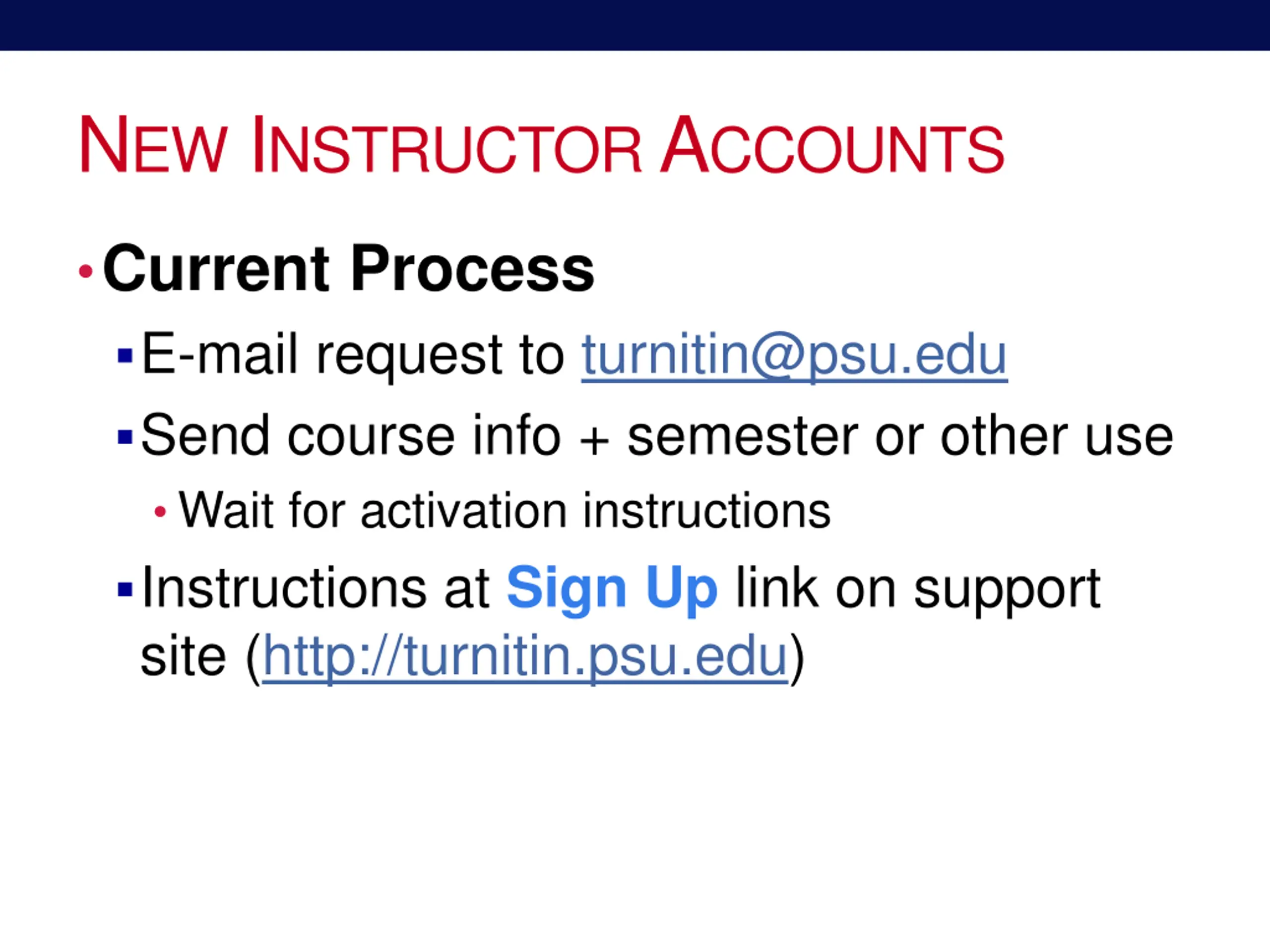 NEW INSTRUCTORACCOUNTS Current Process E-mail request to turnitin@psu.edu Send course info + semester or other use Wait for activation instructions Instructions at Sign Up link on support site (http://turnitin.psu.edu)
