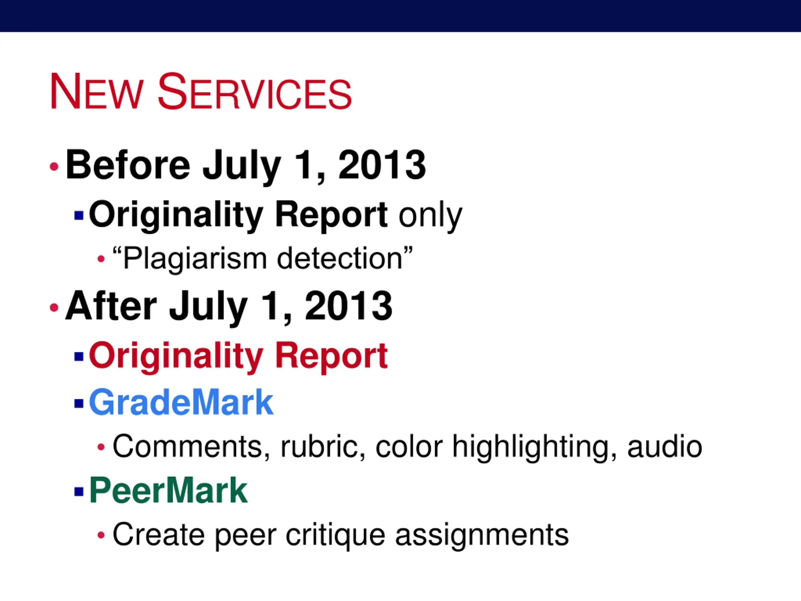 NEW SERVICES Before July 1, 2013 Originality Report only Plagiarism detection After July 1, 2013 Originality Report GradeMark Comments, rubric, color highlighting, audio PeerMark Create peer critique assignments