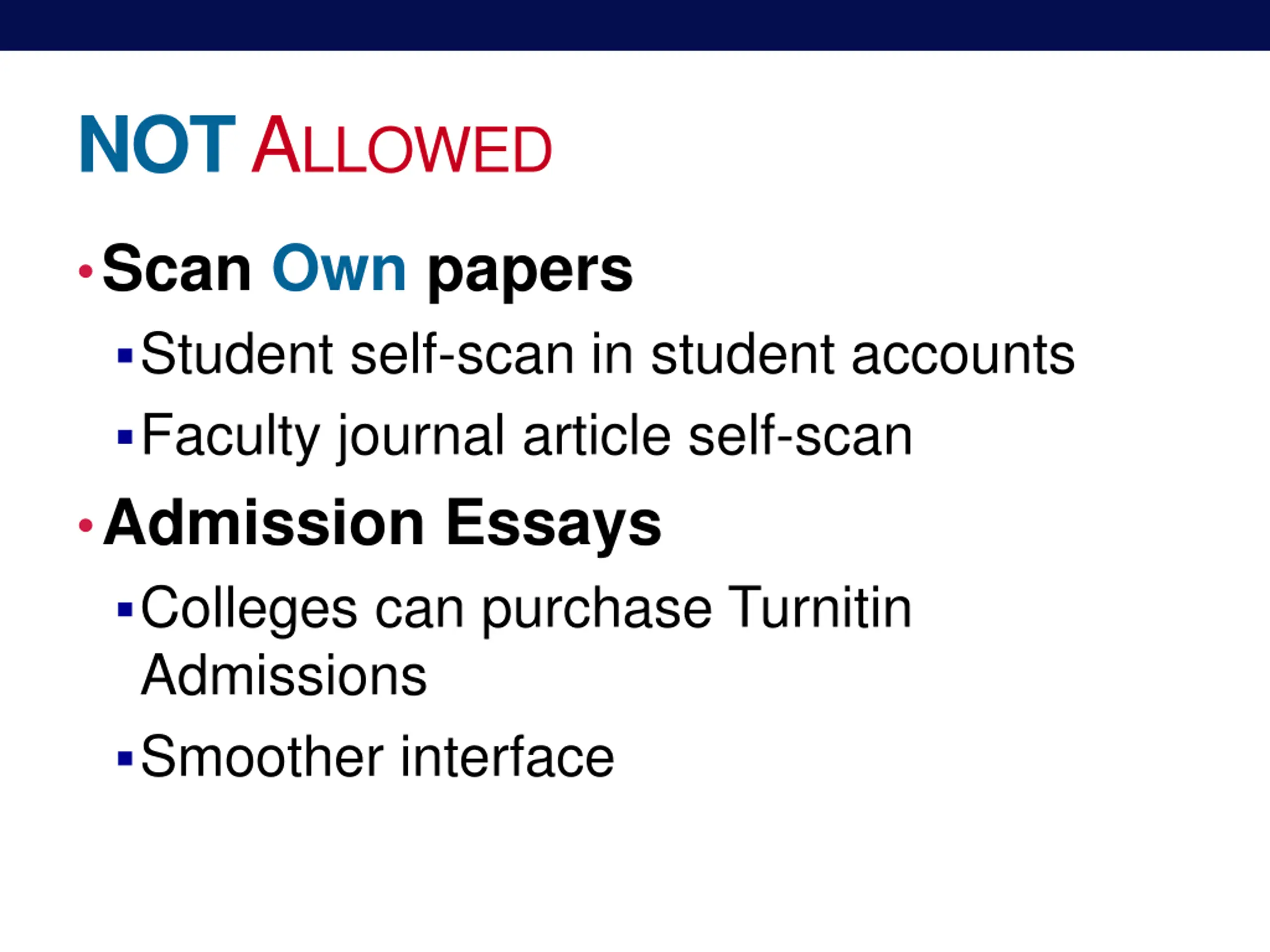 NOTALLOWED Scan Own papers Student self-scan in student accounts Faculty journal article self-scan Admission Essays Colleges can purchase Turnitin Admissions Smoother interface