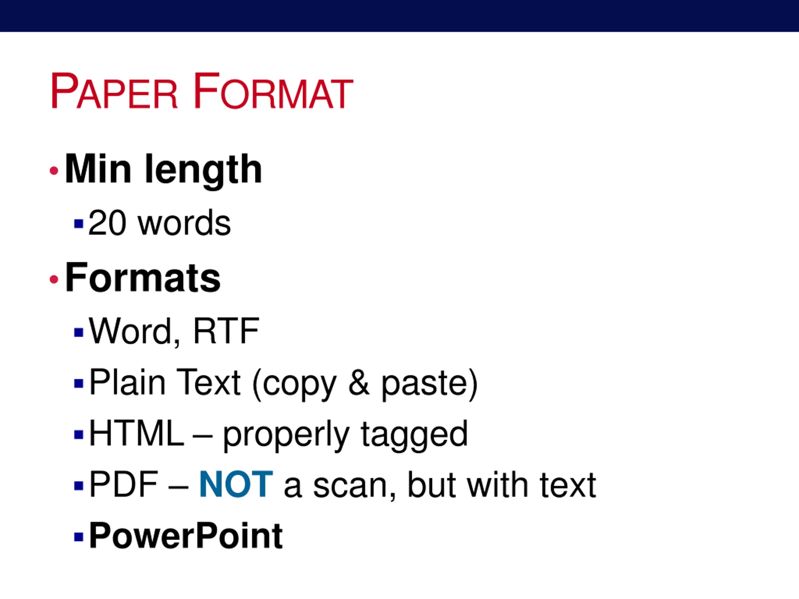 PAPER FORMAT Min length 20 words Formats Word, RTF Plain Text (copy & paste) HTML properly tagged PDF NOT a scan, but with text PowerPoint