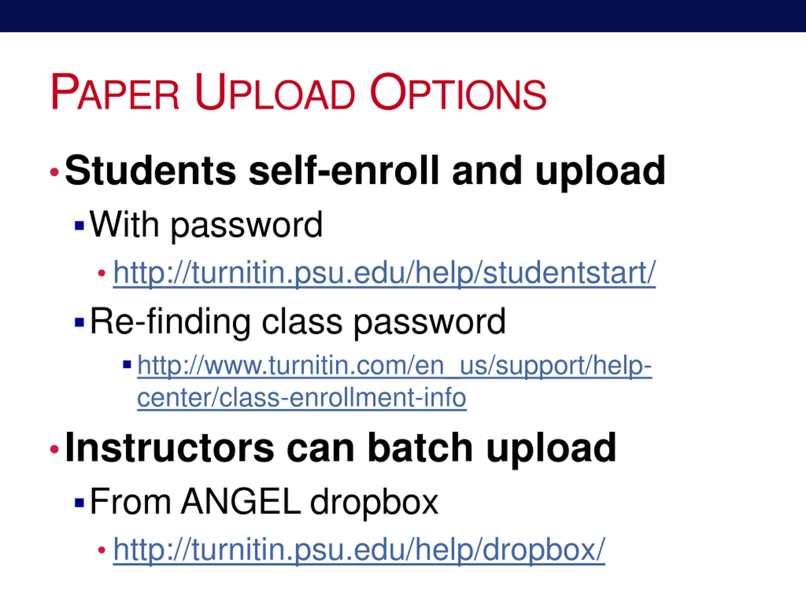 PAPER UPLOAD OPTIONS Students self-enroll and upload With password http://turnitin.psu.edu/help/studentstart/ Re-finding class password http://www.turnitin.com/en_us/support/help- center/class-enrollment-info Instructors can batch upload From ANGEL dropbox http://turnitin.psu.edu/help/dropbox/