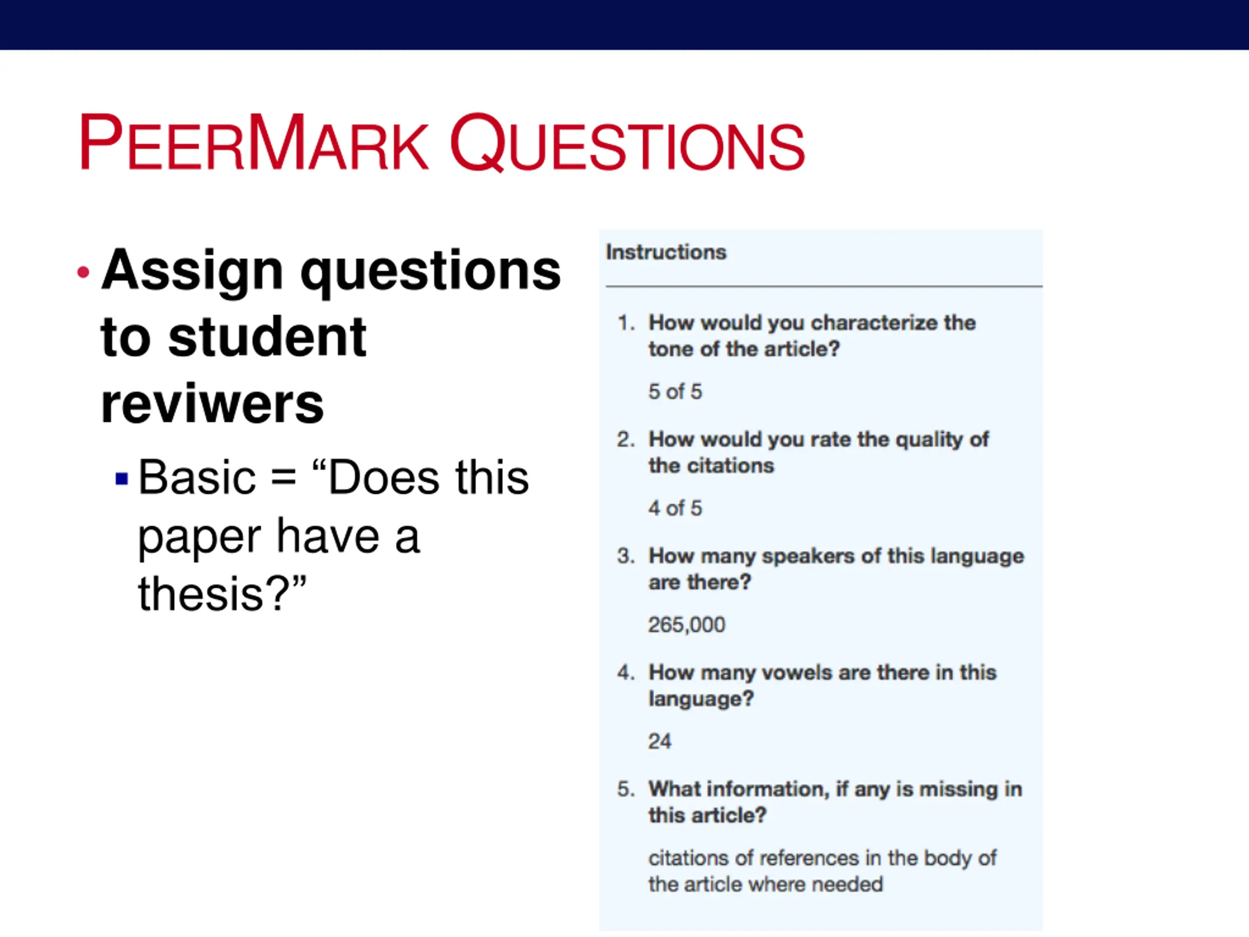 PEERMARK QUESTIONS Assign questions to student reviwers Basic = Does this paper have a thesis?