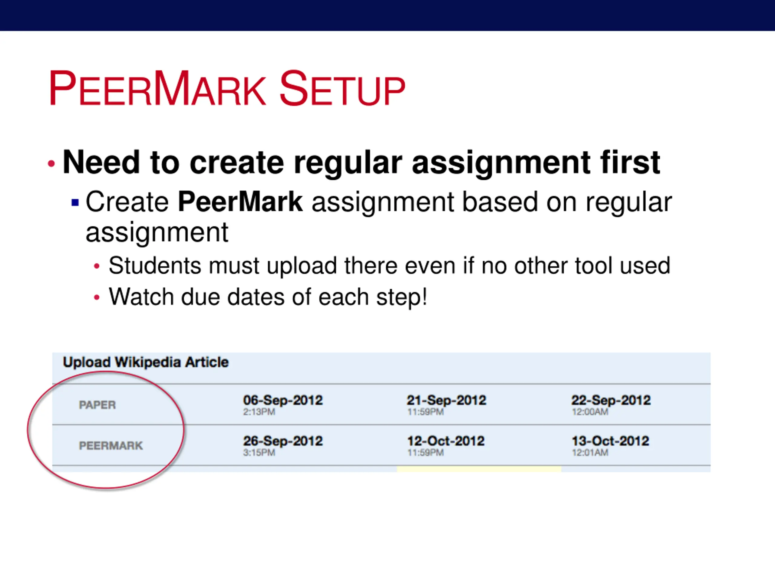 PEERMARK SETUP Need to create regular assignment first Create PeerMark assignment based on regular assignment Students must upload there even if no other tool used Watch due dates of each step!