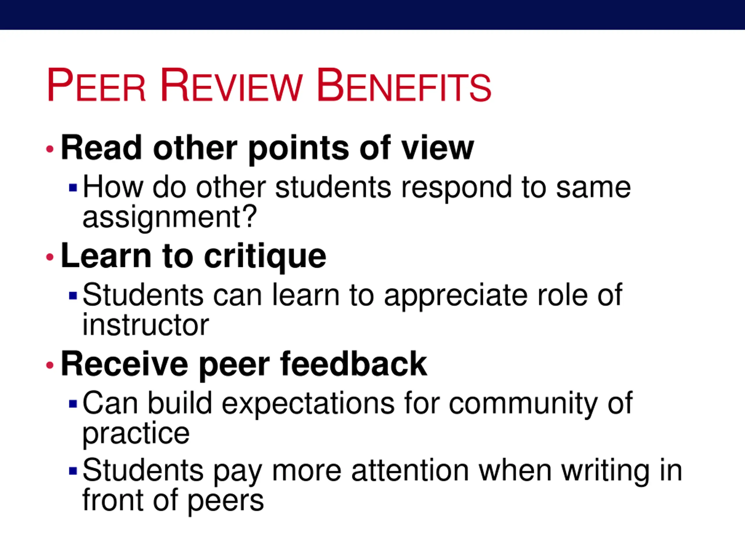 PEER REVIEW BENEFITS Read other points of view How do other students respond to same assignment? Learn to critique Students can learn to appreciate role of instructor Receive peer feedback Can build expectations for community of practice Students pay more attention when writing in front of peers
