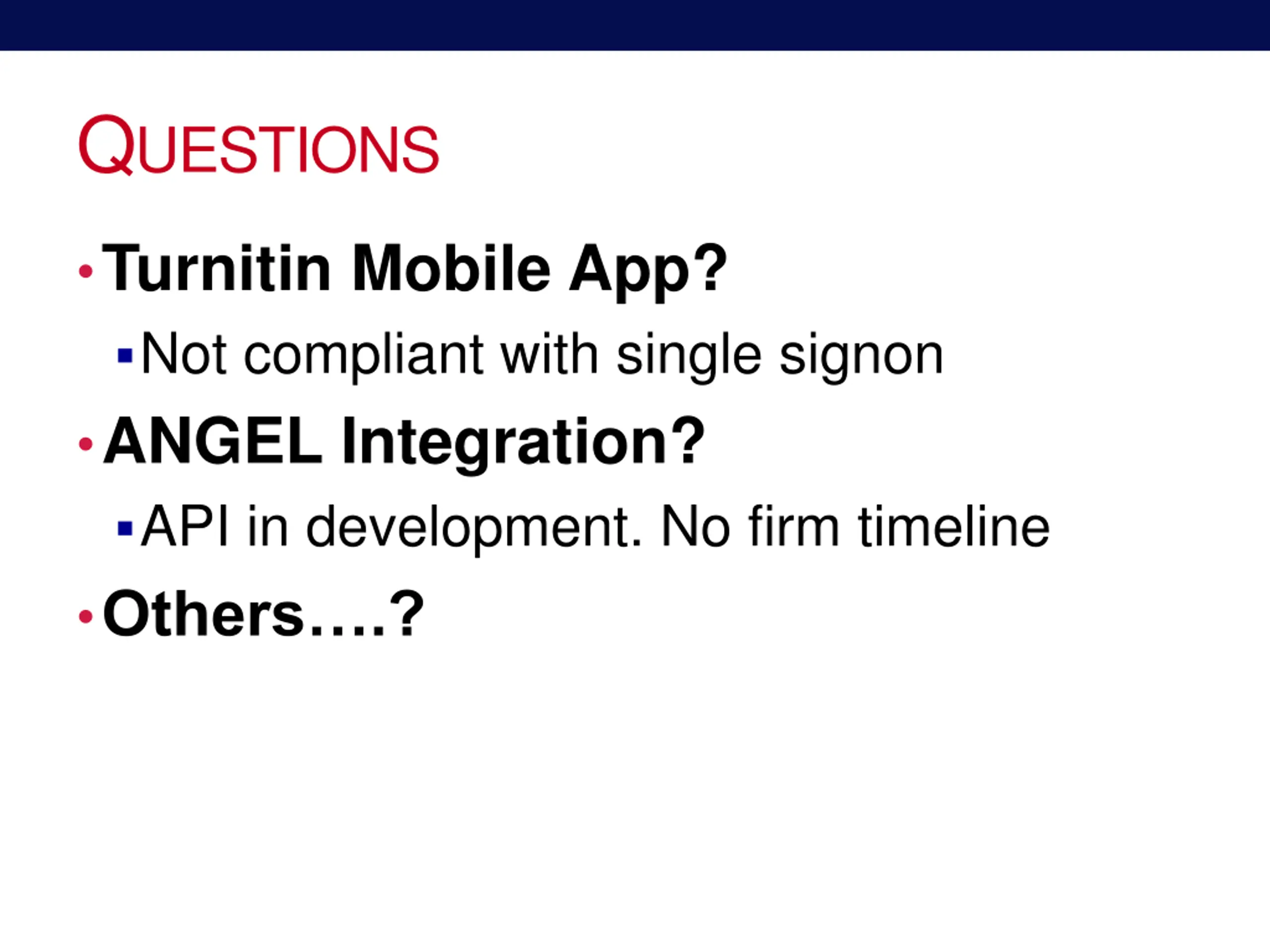 QUESTIONS Turnitin Mobile App? Not compliant with single signon ANGEL Integration? API in development. No firm timeline Others .?