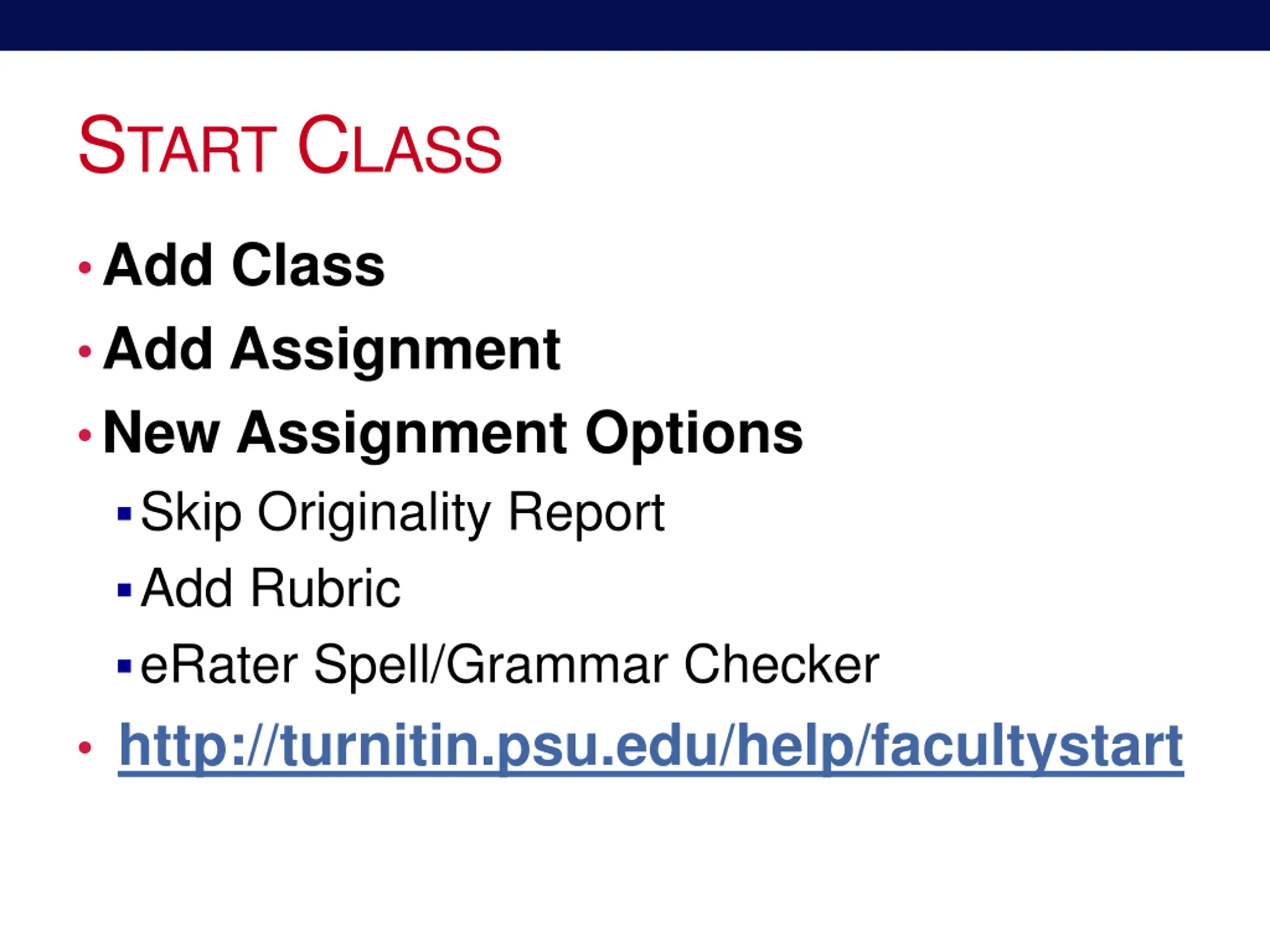 START CLASS Add Class Add Assignment New Assignment Options Skip Originality Report Add Rubric eRater Spell/Grammar Checker http://turnitin.psu.edu/help/facultystart