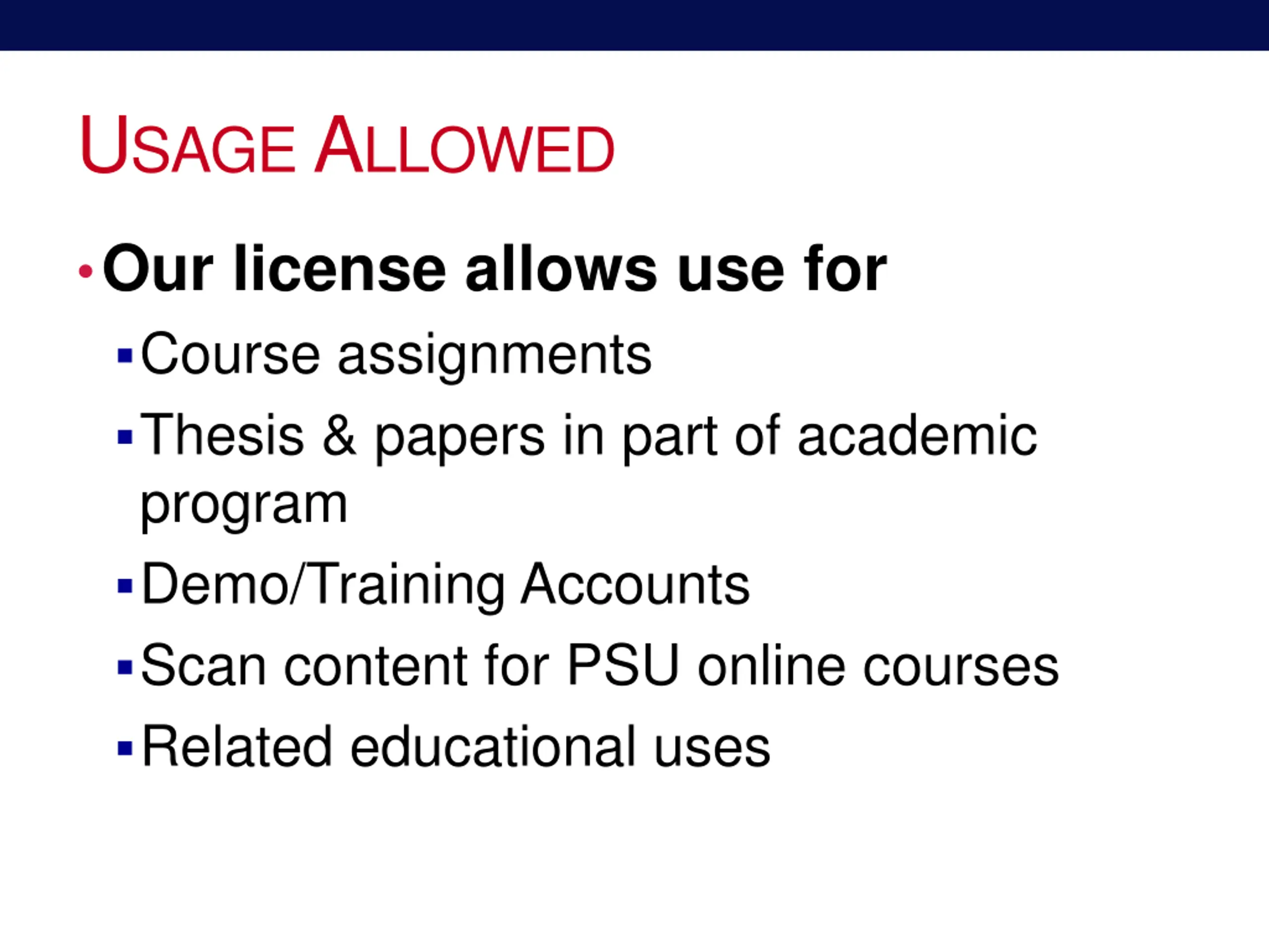 USAGEALLOWED Our license allows use for Course assignments Thesis & papers in part of academic program Demo/Training Accounts Scan content for PSU online courses Related educational uses