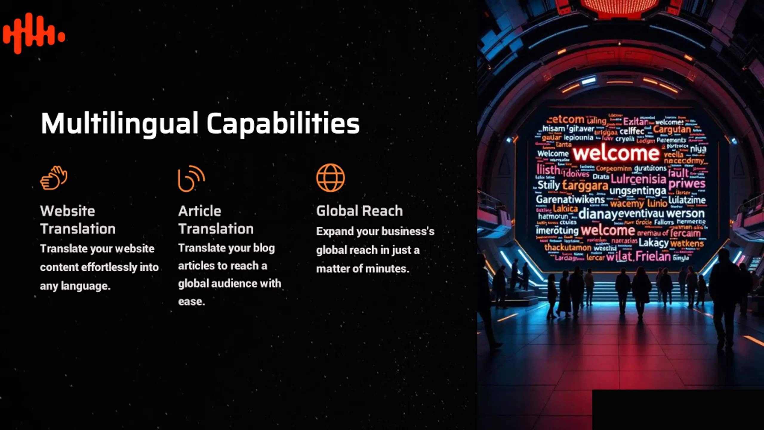 Multilingual Capabilities Multilingual Capabilities Global Reach Expand your business's global reach in just a matter of minutes. Global Reach Website Translation Translate your website content effortlessly into any language. Website Translation Article Translation Translate your blog articles to reach a global audience with ease. Article Translation