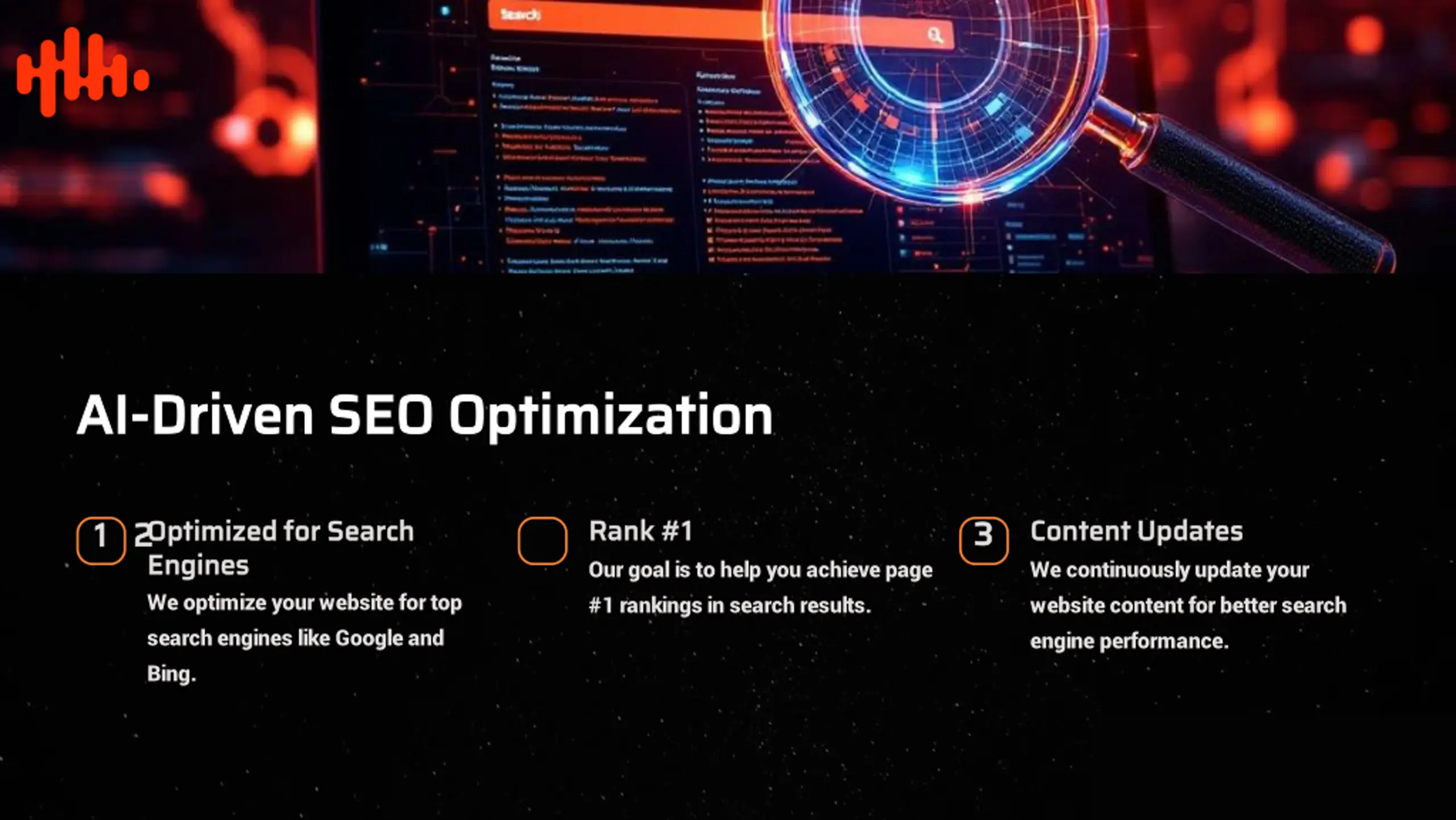 AI AI- -Driven SEO Optimization Driven SEO Optimization 3 3 Rank #1 Our goal is to help you achieve page #1 rankings in search results. Rank #1 Content Updates We continuously update your website content for better search engine performance. Content Updates 1 2 1 2 Optimized for Search Engines We optimize your website for top search engines like Google and Bing. Optimized for Search Engines