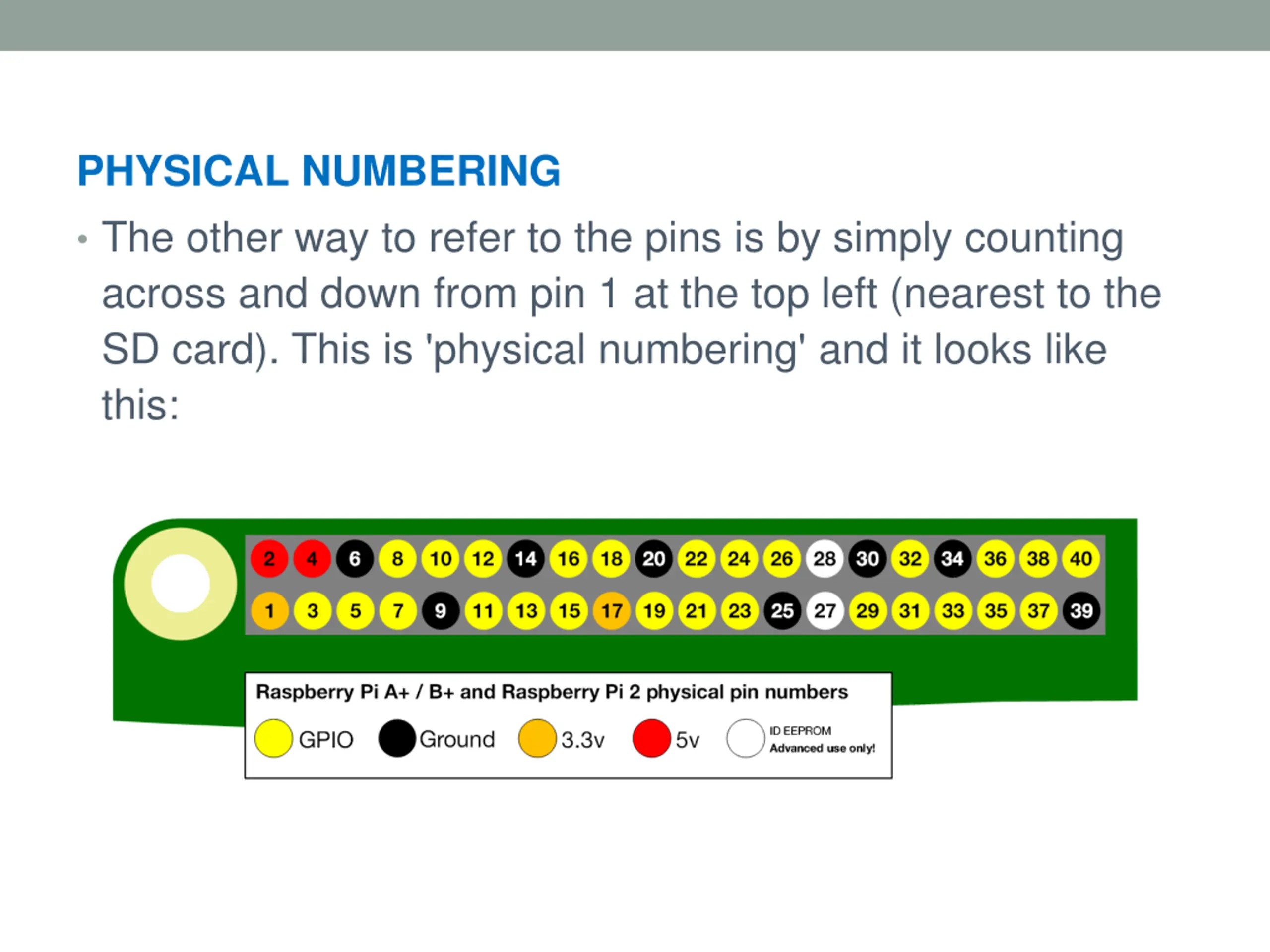 PHYSICAL NUMBERING The other way to refer to the pins is by simply counting across and down from pin 1 at the top left (nearest to the SD card). This is 'physical numbering' and it looks like this: