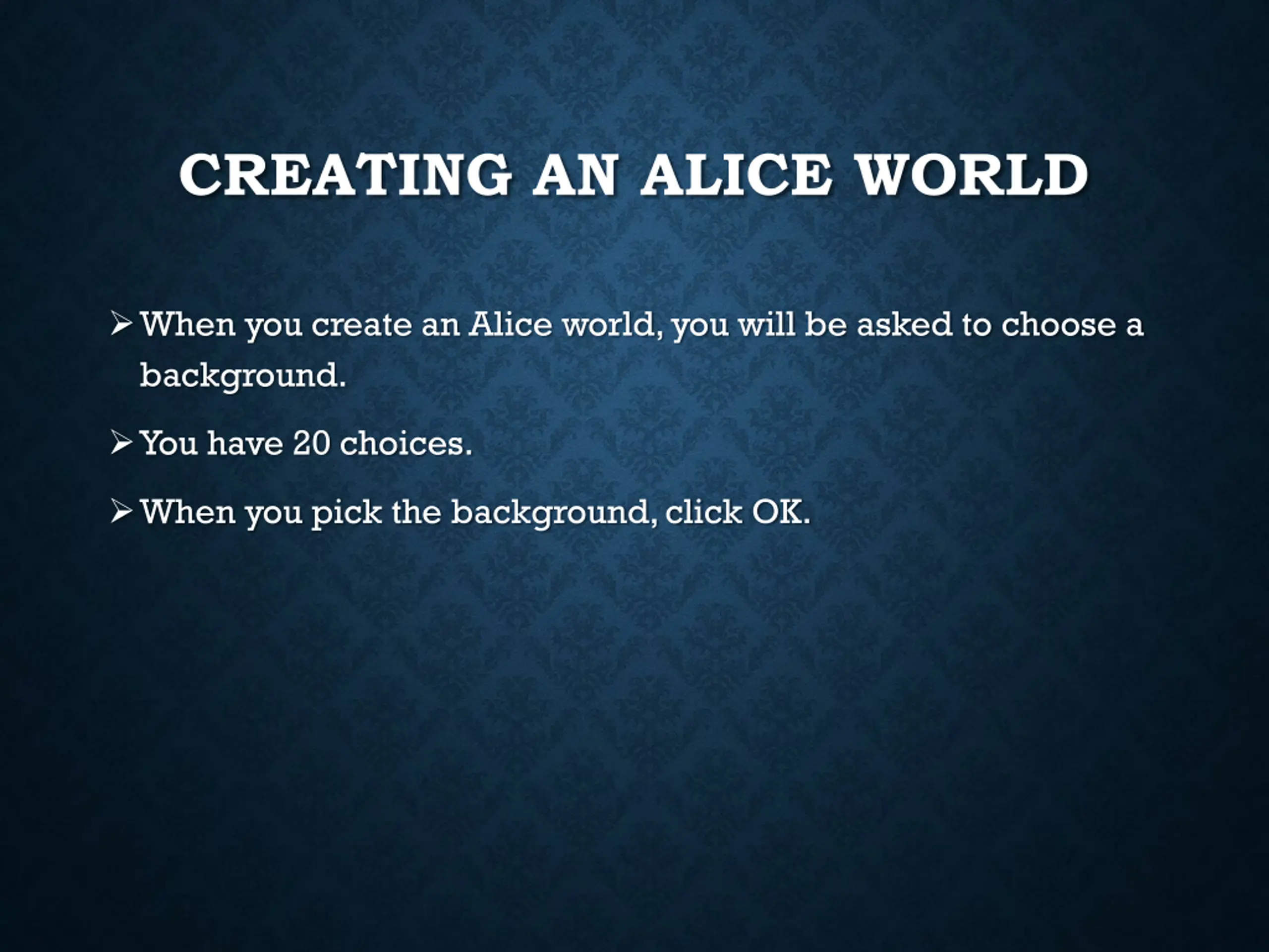 CREATING AN ALICE WORLD When you create an Alice world, you will be asked to choose a background. You have 20 choices. When you pick the background, click OK.