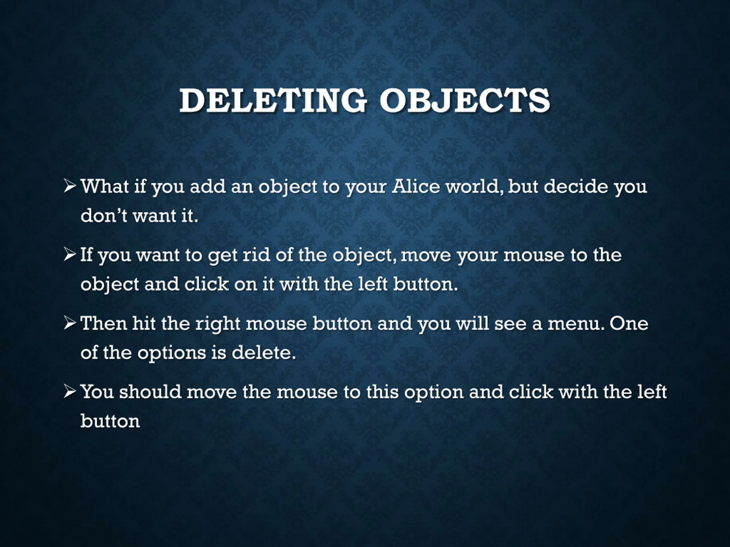 DELETING OBJECTS What if you add an object to your Alice world, but decide you don t want it. If you want to get rid of the object, move your mouse to the object and click on it with the left button. Then hit the right mouse button and you will see a menu. One of the options is delete. You should move the mouse to this option and click with the left button