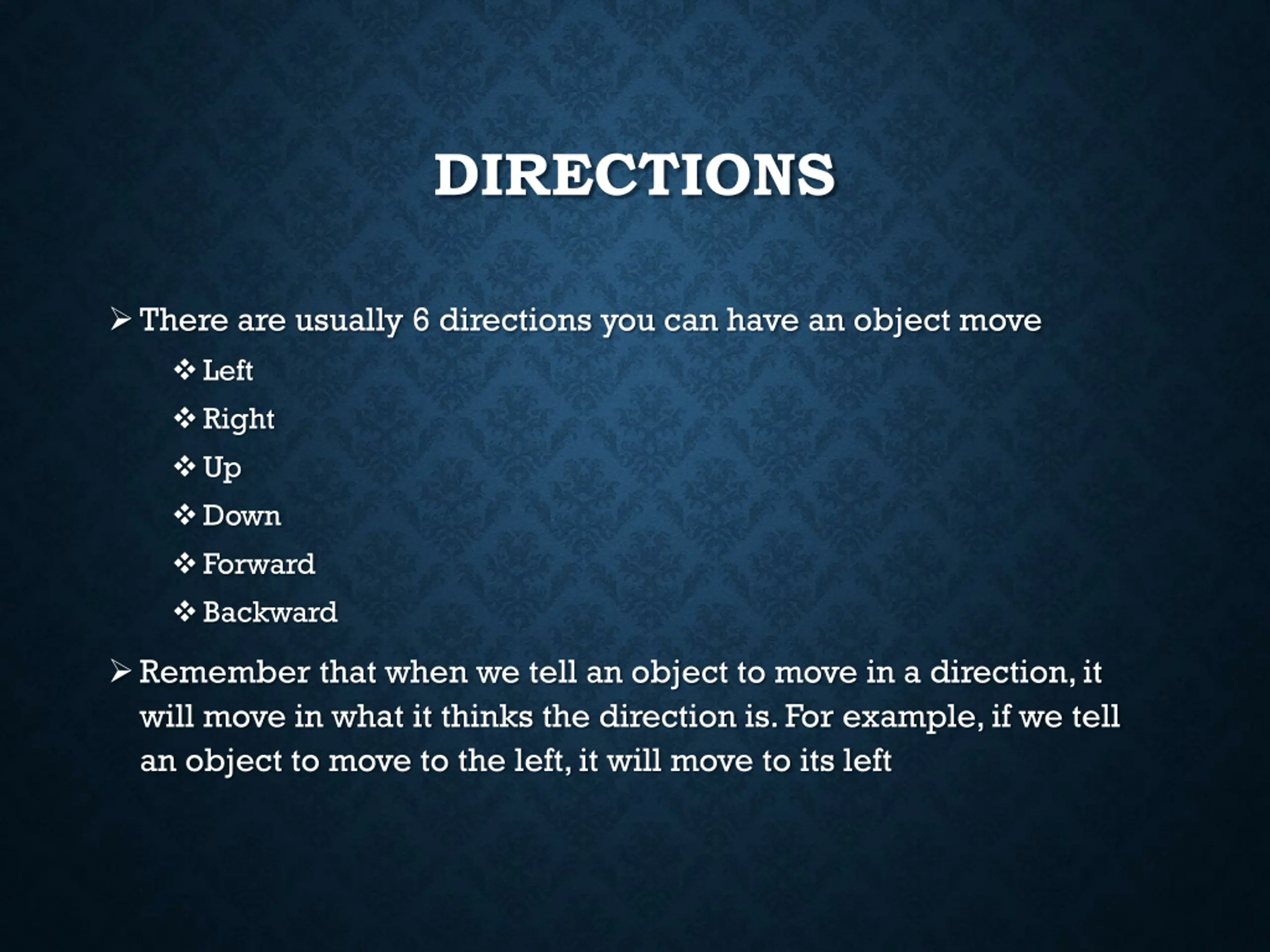 DIRECTIONS There are usually 6 directions you can have an object move Left Right Up Down Forward Backward Remember that when we tell an object to move in a direction, it will move in what it thinks the direction is. For example, if we tell an object to move to the left, it will move to its left