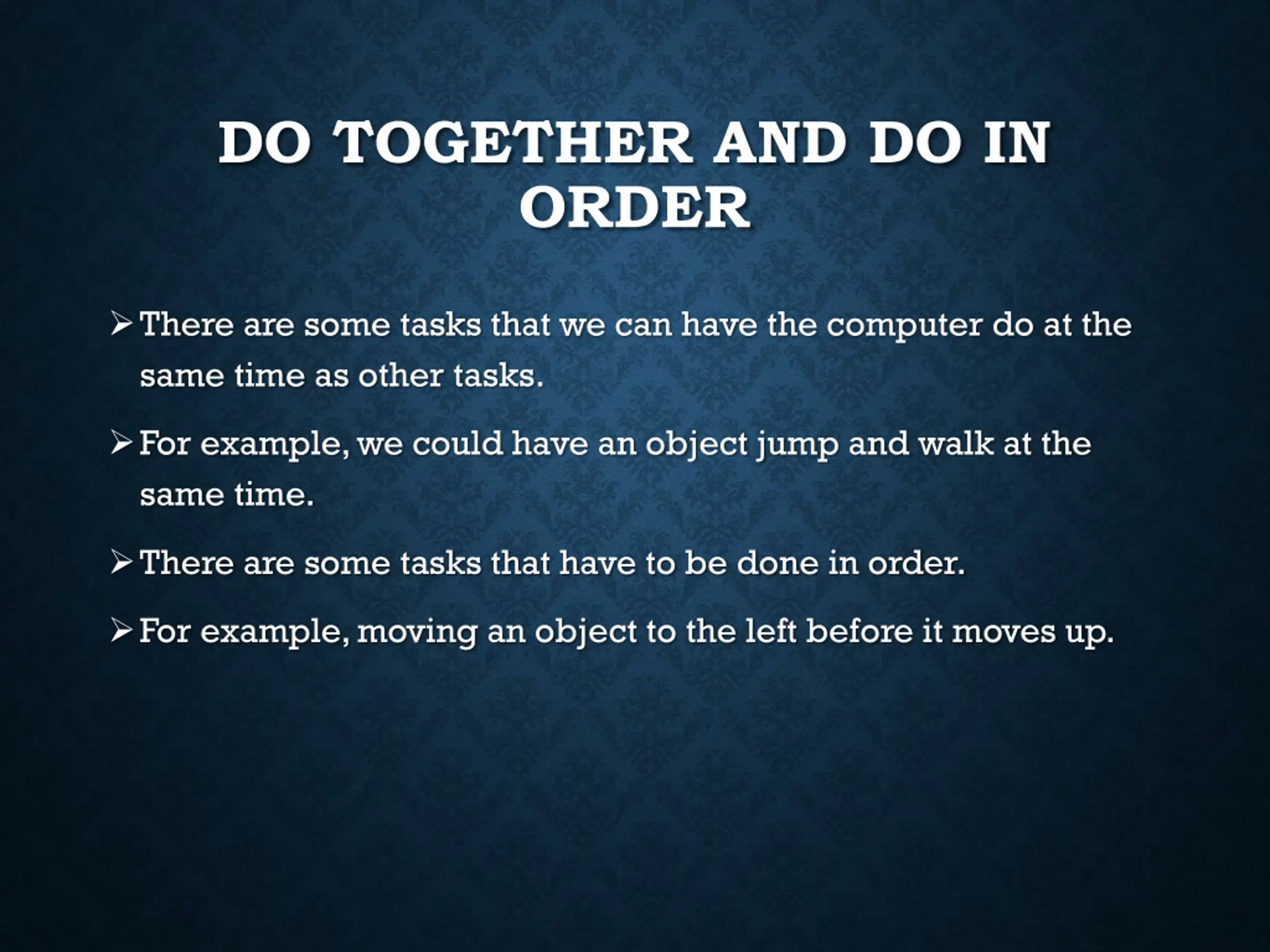 DO TOGETHER AND DO IN ORDER There are some tasks that we can have the computer do at the same time as other tasks. For example, we could have an object jump and walk at the same time. There are some tasks that have to be done in order. For example, moving an object to the left before it moves up.