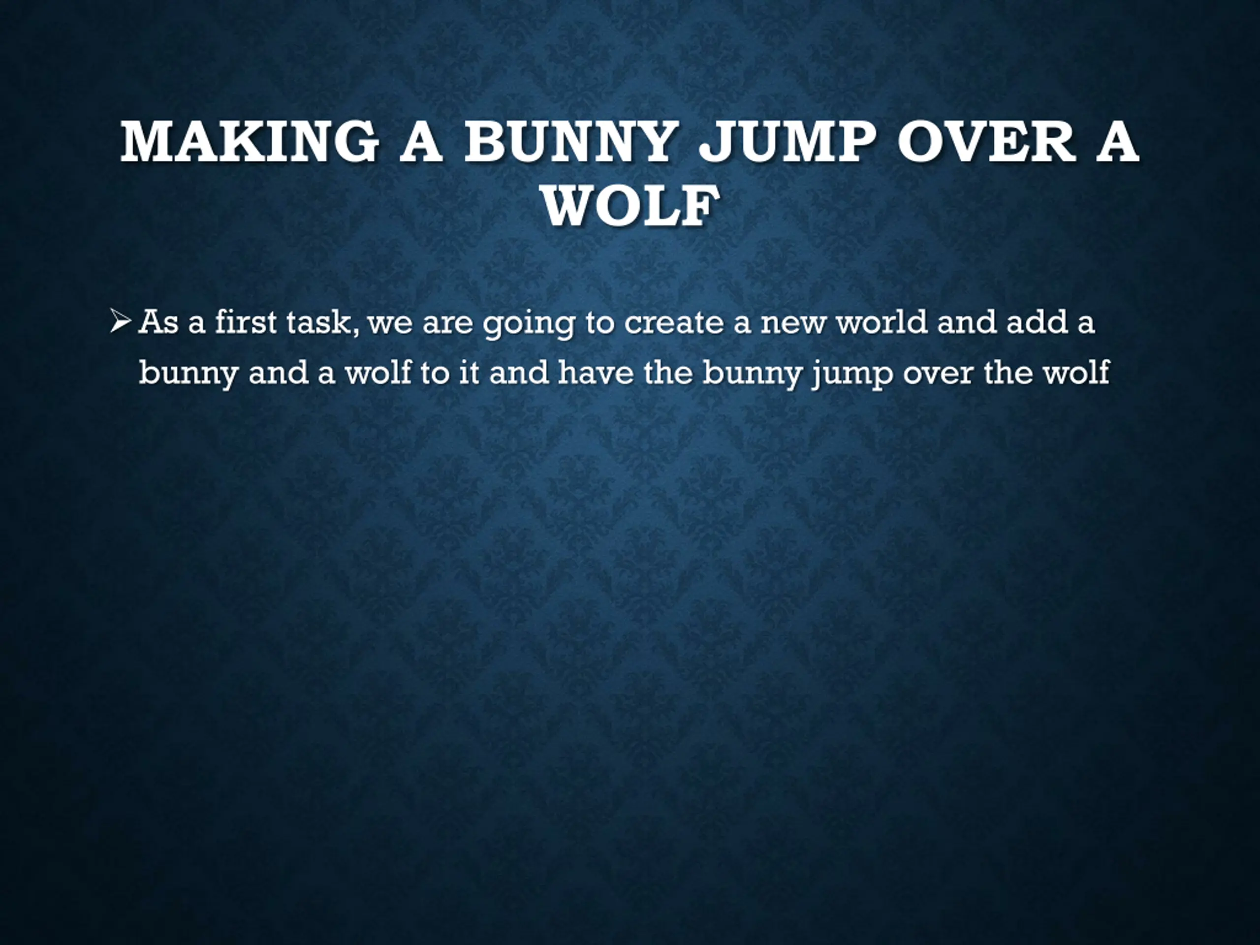 MAKING A BUNNY JUMP OVER A WOLF As a first task, we are going to create a new world and add a bunny and a wolf to it and have the bunny jump over the wolf