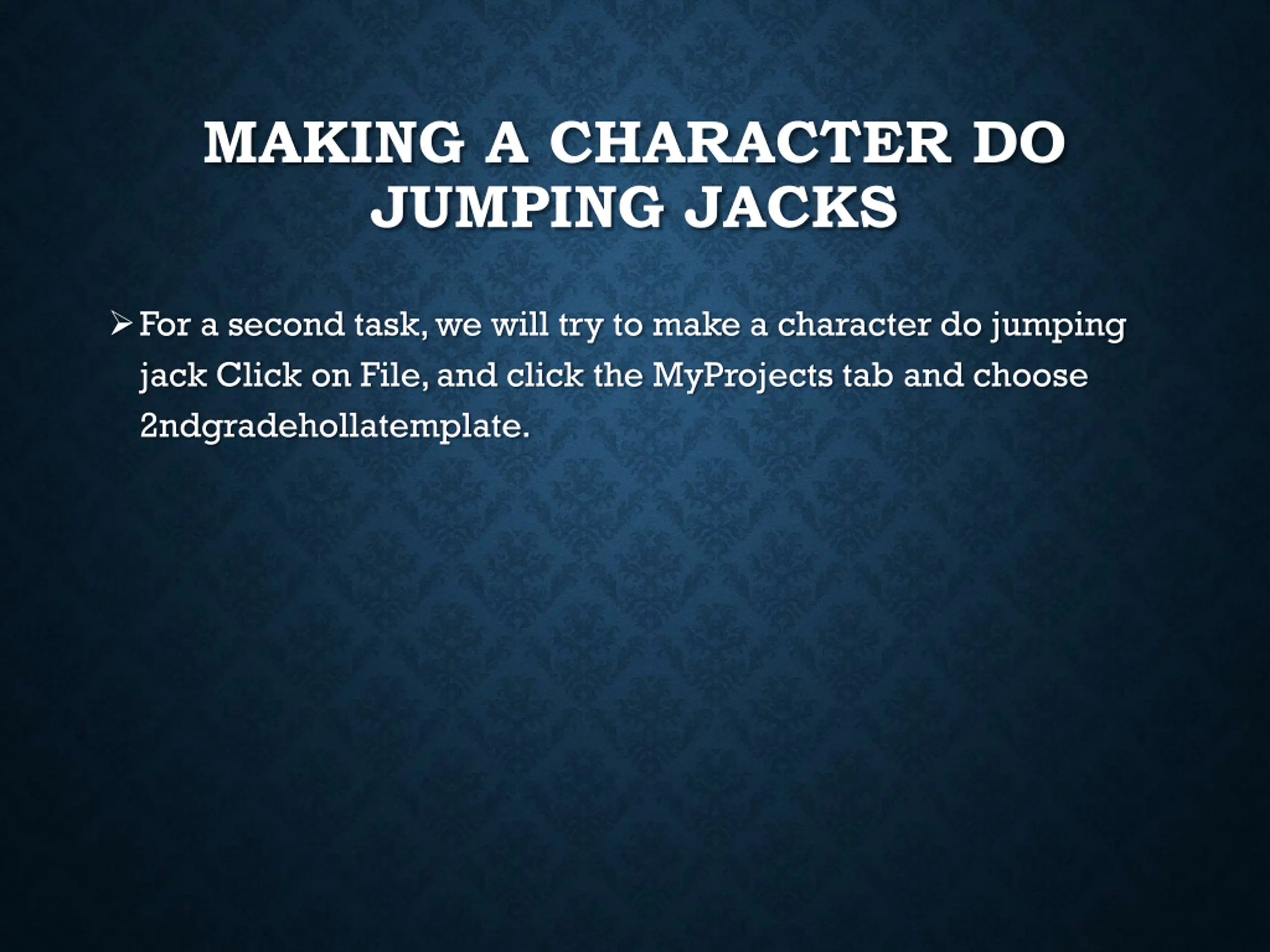 MAKING A CHARACTER DO JUMPING JACKS For a second task, we will try to make a character do jumping jack Click on File, and click the MyProjects tab and choose 2ndgradehollatemplate.