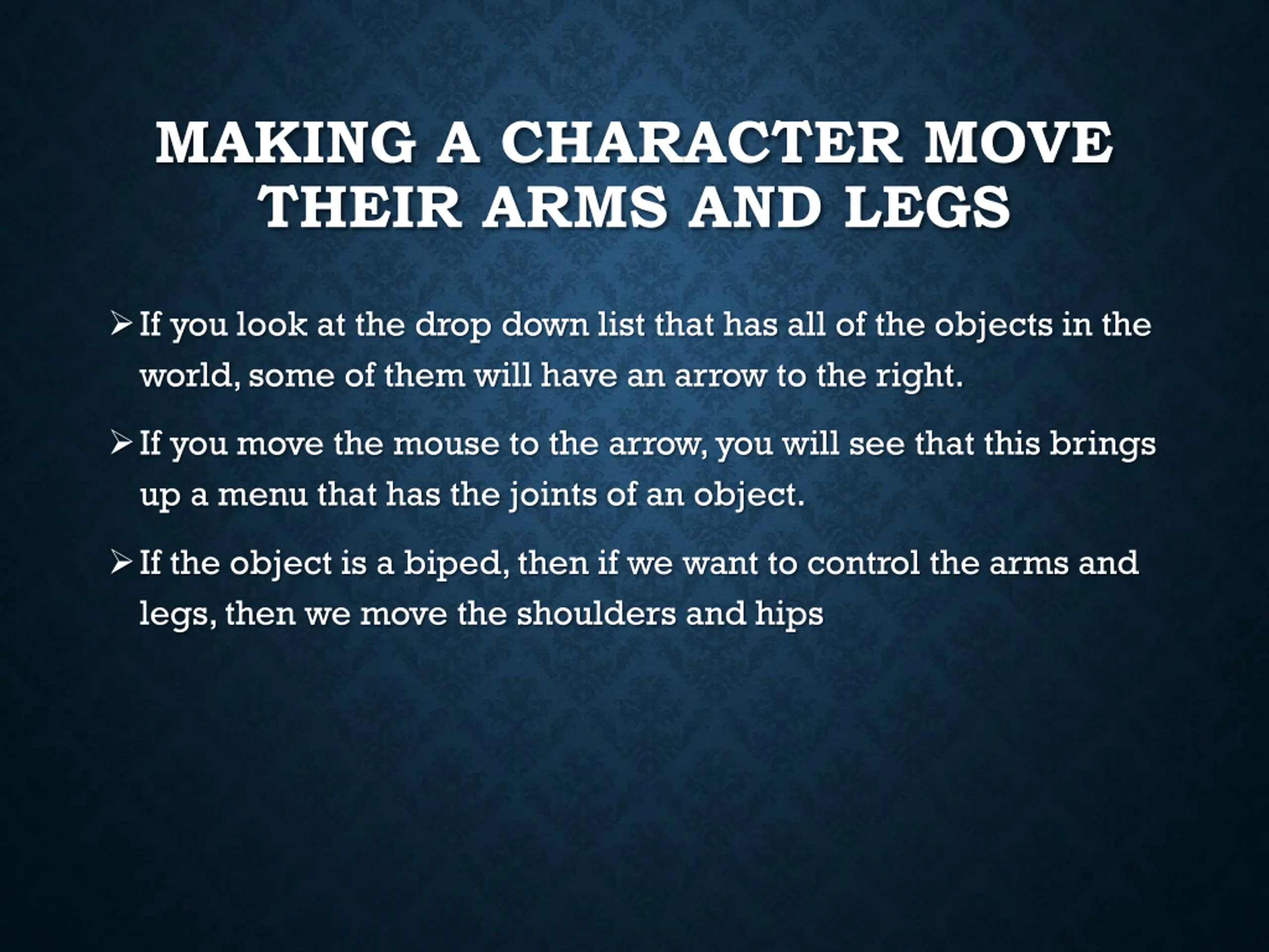 MAKING A CHARACTER MOVE THEIR ARMS AND LEGS If you look at the drop down list that has all of the objects in the world, some of them will have an arrow to the right. If you move the mouse to the arrow, you will see that this brings up a menu that has the joints of an object. If the object is a biped, then if we want to control the arms and legs, then we move the shoulders and hips