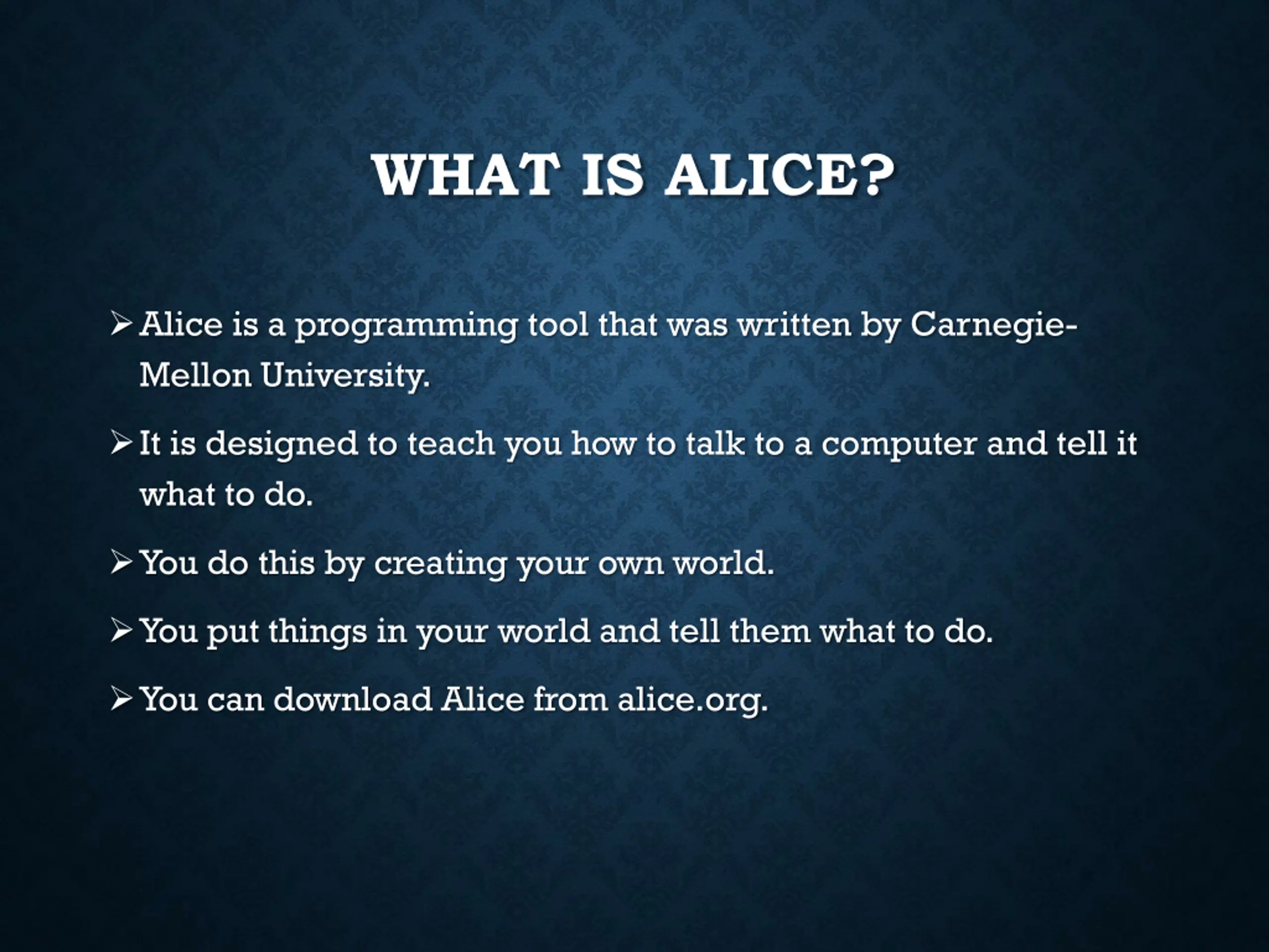 WHAT IS ALICE? Alice is a programming tool that was written by Carnegie- Mellon University. It is designed to teach you how to talk to a computer and tell it what to do. You do this by creating your own world. You put things in your world and tell them what to do. You can download Alice from alice.org.