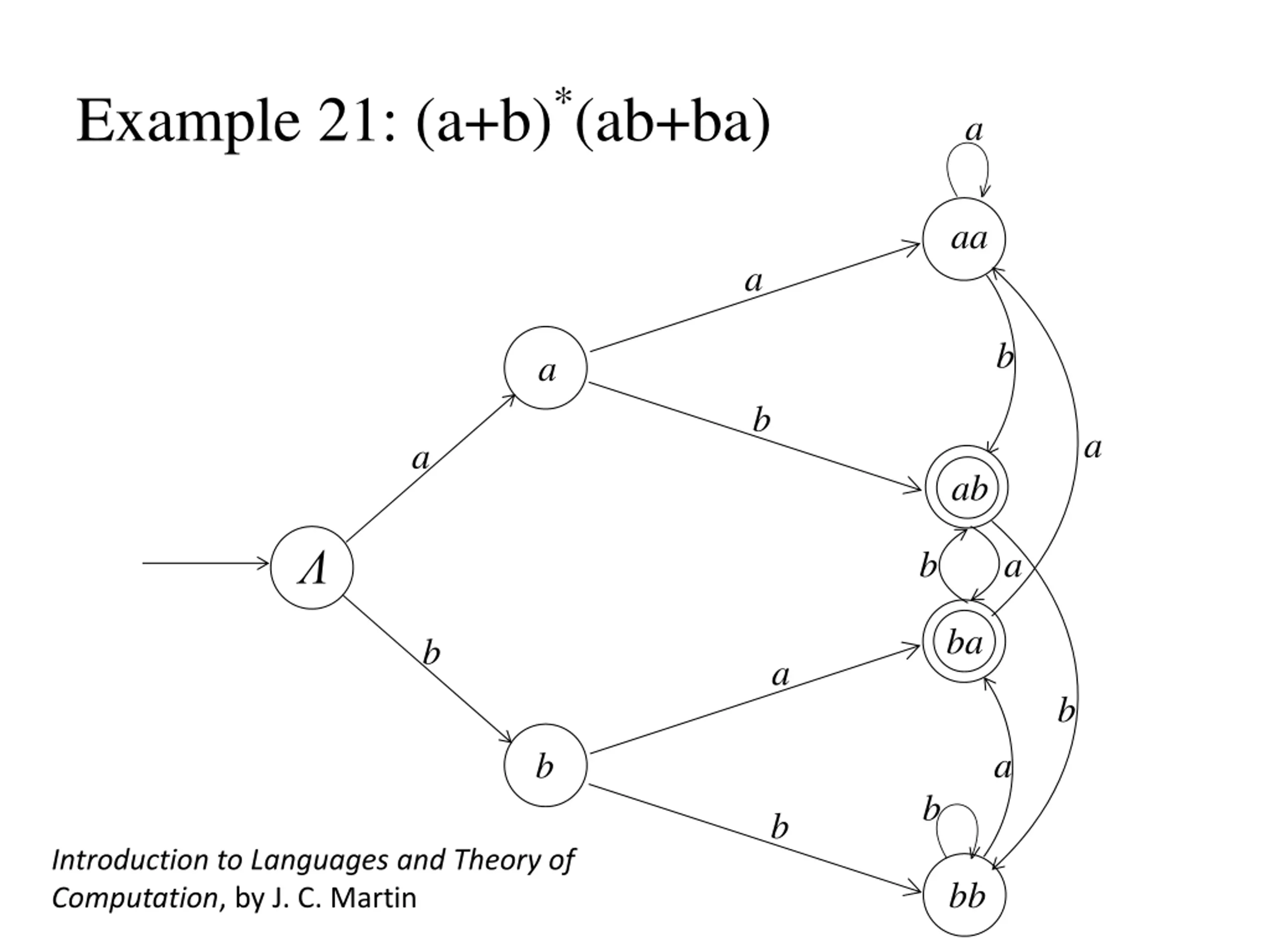 Example 21: (a+b)*(ab+ba) a aa a b a b a a ab b a ba b a b a b b b Introduction to Languages and Theory of Computation, by J. C. Martin bb