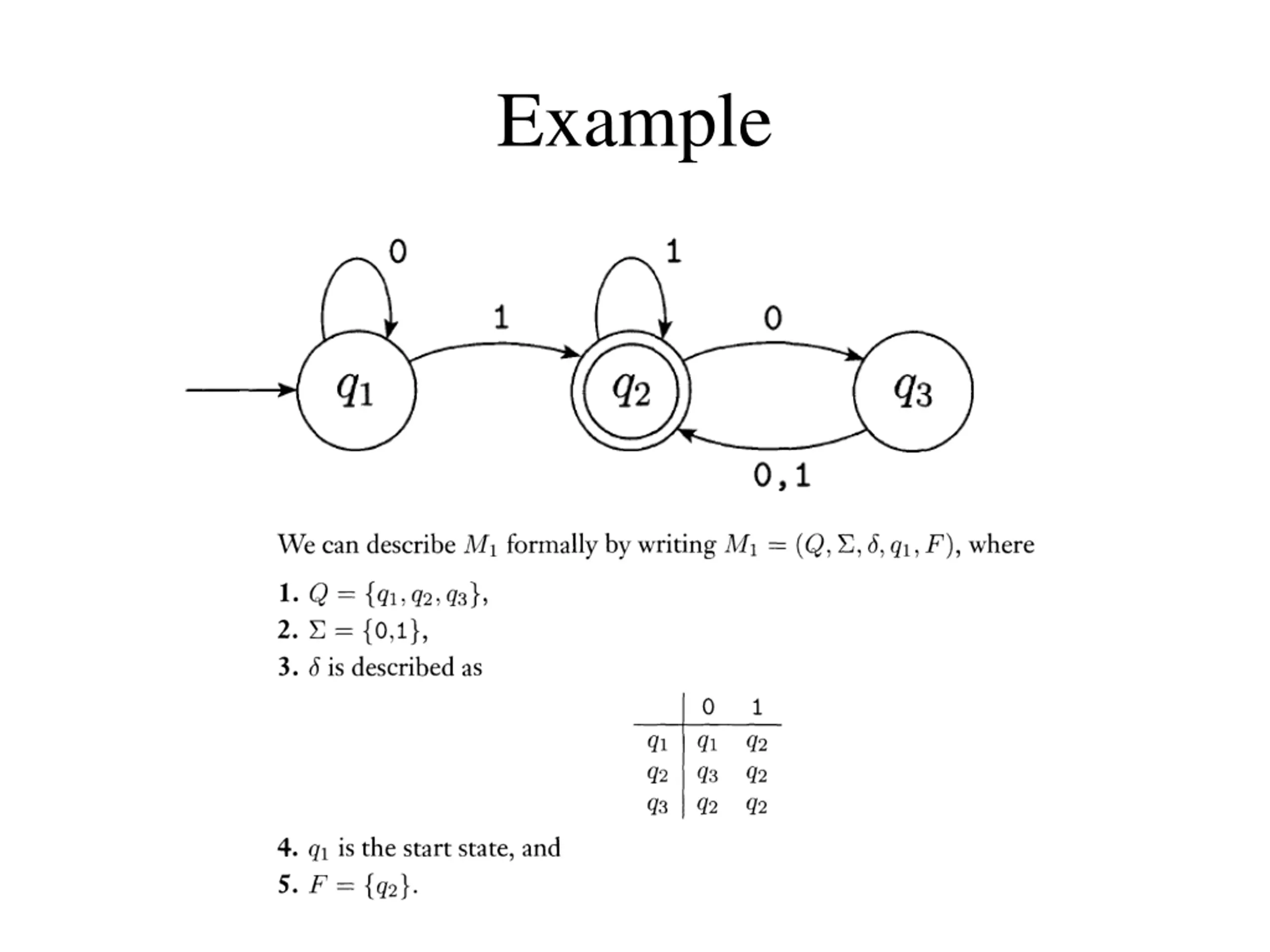 Example 0 1 0,1 1 0 q0 q1 q2 transition function alphabet = {0, 1} start stateQ = {q0, q1, q2} initial stateq0 accepting statesF = {q0, q1} inputs 0 q0 q2 q2 1 q1 q1 q0 q1 q2 states q2