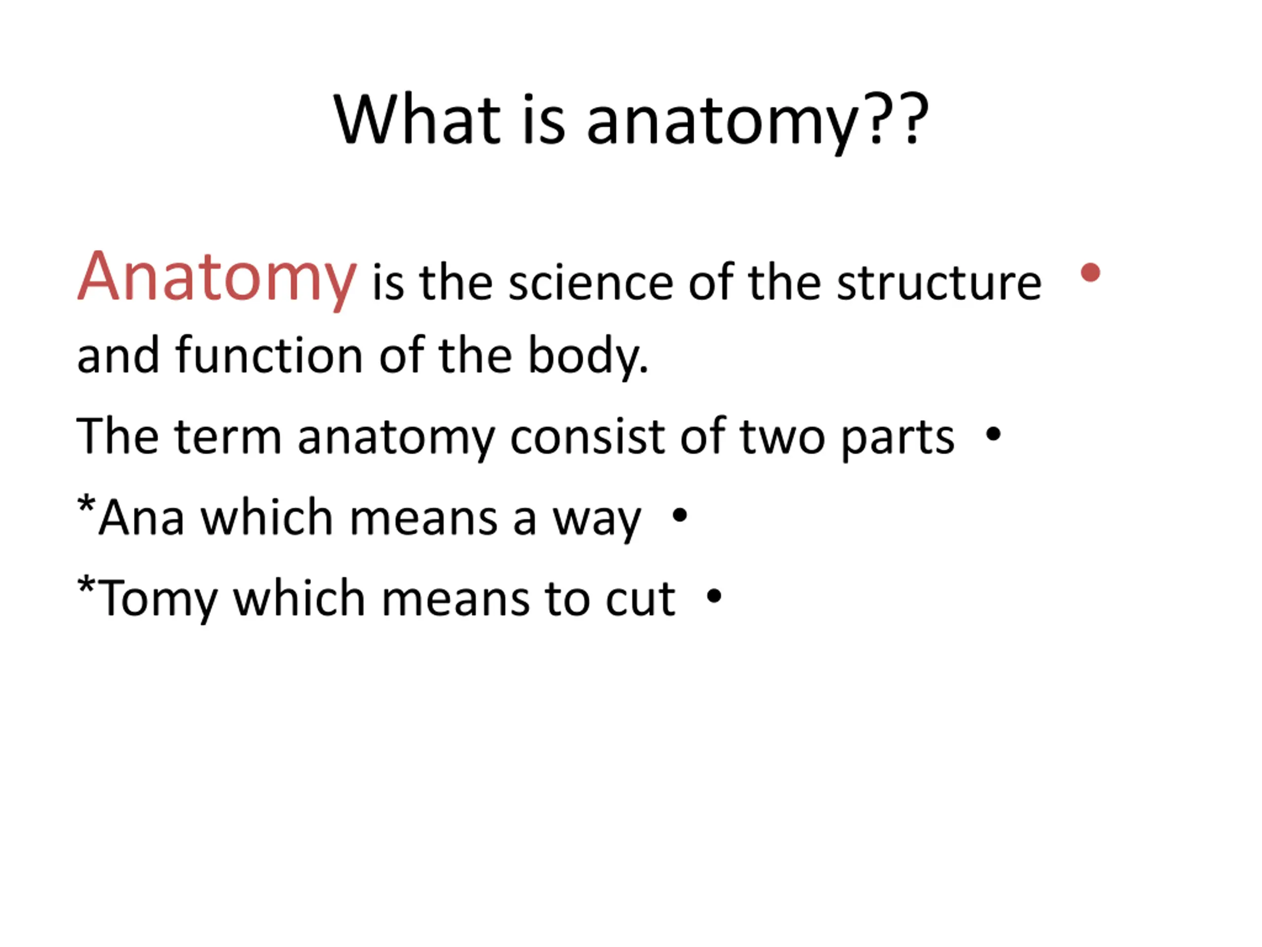 What is anatomy?? Anatomy is the science of the structure and function of the body. The term anatomy consist of two parts Ana which means a way * Tomy which means to cut *
