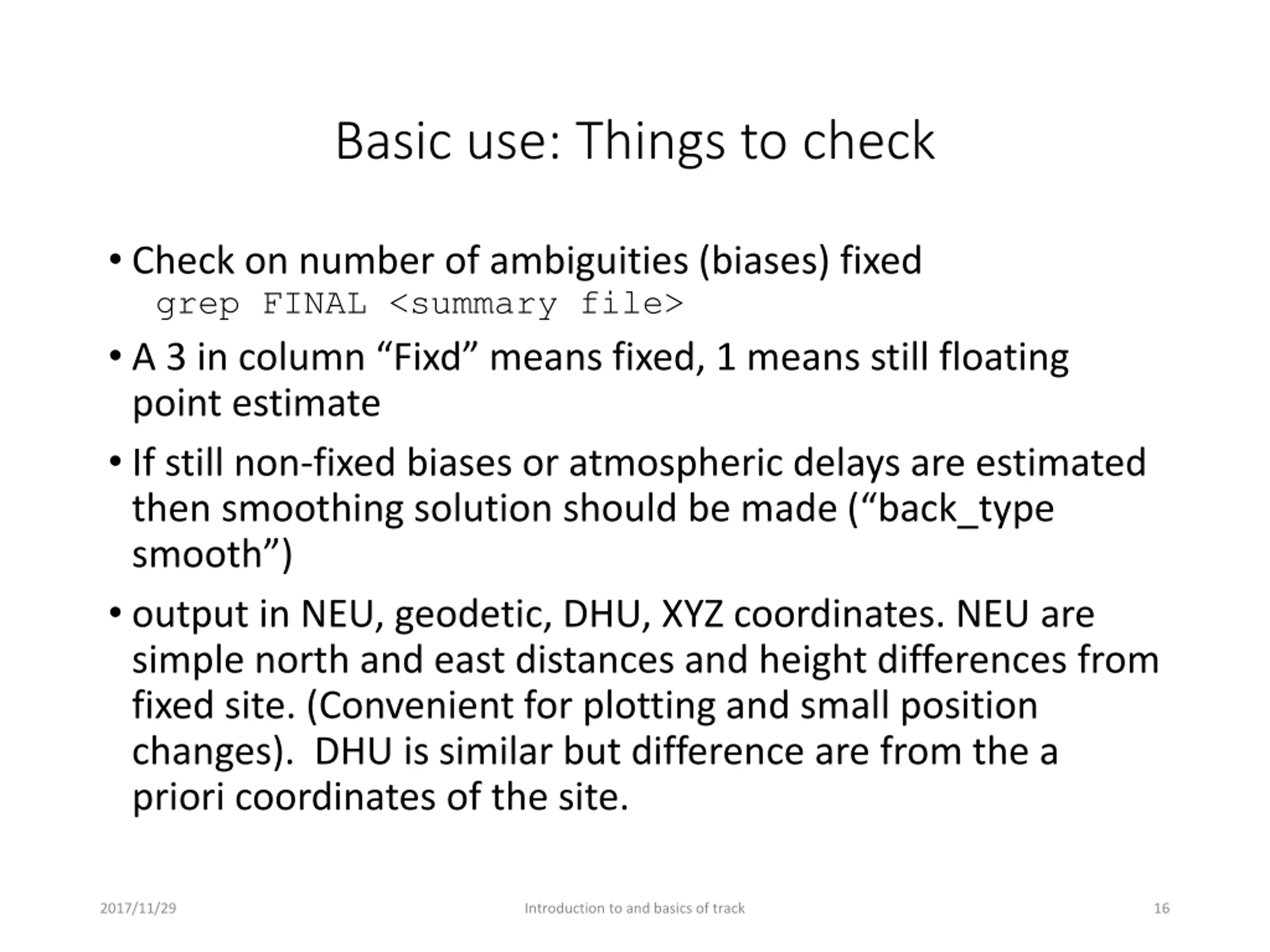 Basic use: Things to check Check on number of ambiguities (biases) fixed grep FINAL <summary file> A 3 in column Fixd means fixed, 1 means still floating point estimate If still non-fixed biases or atmospheric delays are estimated then smoothing solution should be made ( back_type smooth ) output in NEU, geodetic, DHU, XYZ coordinates. NEU are simple north and east distances and height differences from fixed site. (Convenient for plotting and small position changes). DHU is similar but difference are from the a priori coordinates of the site. 2017/11/29 Introduction to and basics of track 16