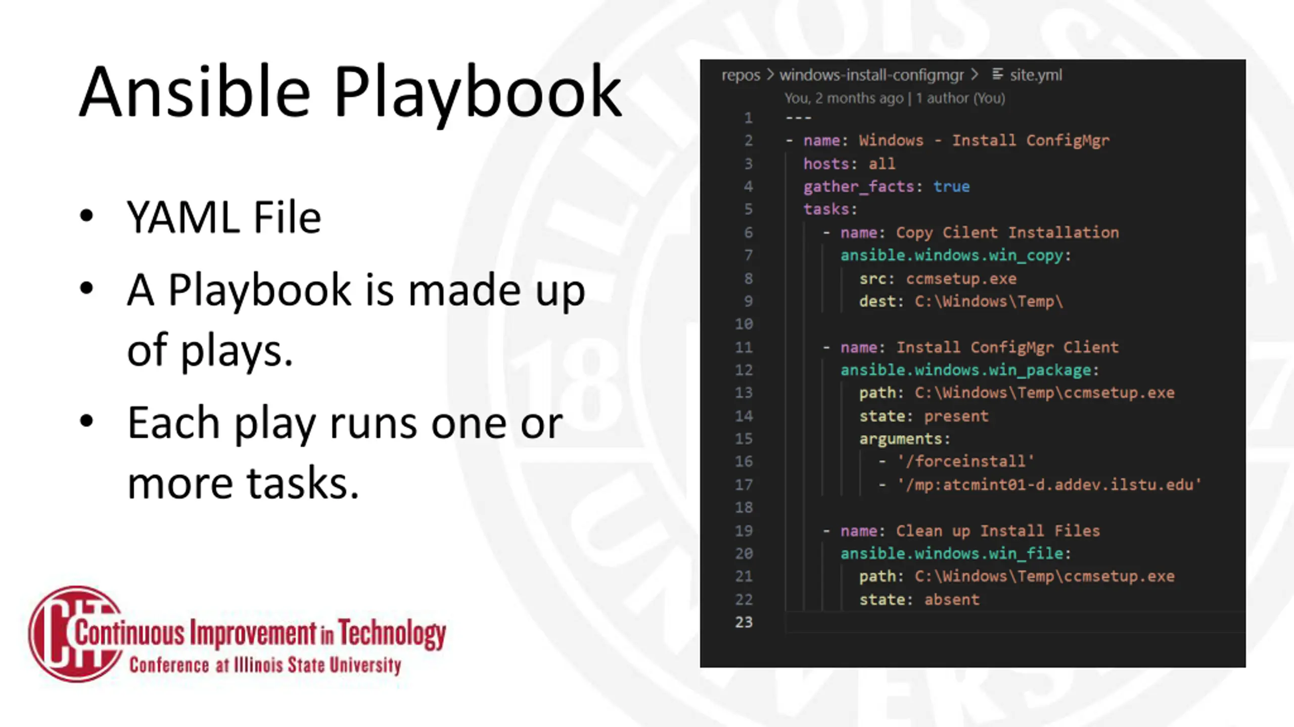 Ansible Playbook YAML File A Playbook is made up of plays. Each play runs one or more tasks.