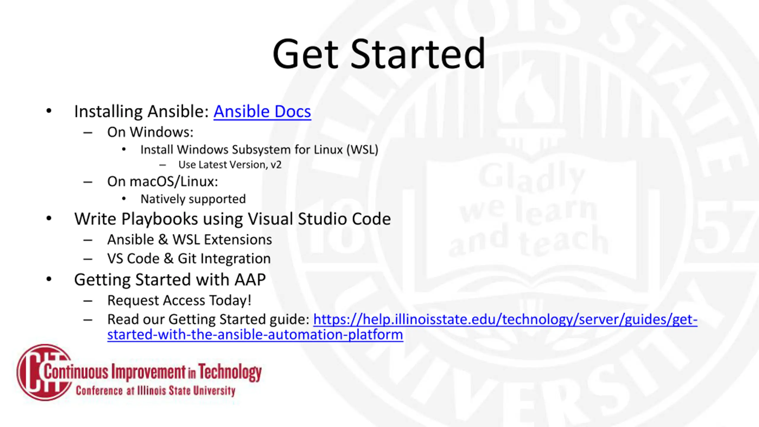 Get Started Installing Ansible: Ansible Docs On Windows: Install Windows Subsystem for Linux (WSL) Use Latest Version, v2 On macOS/Linux: Natively supported Write Playbooks using Visual Studio Code Ansible & WSL Extensions VS Code & Git Integration Getting Started with AAP Request Access Today! Read our Getting Started guide: https://help.illinoisstate.edu/technology/server/guides/get- started-with-the-ansible-automation-platform