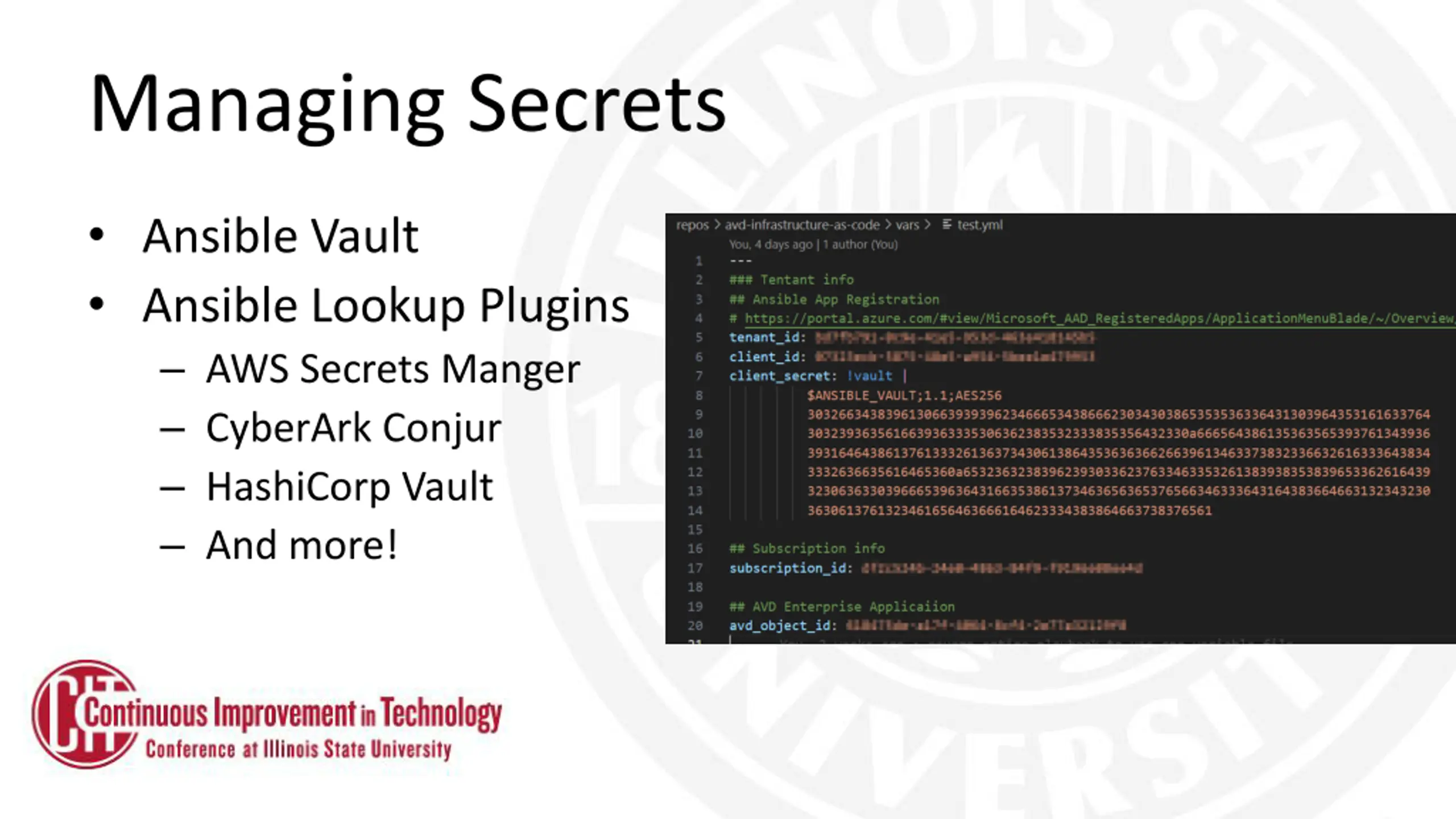 Managing Secrets Ansible Vault Ansible Lookup Plugins AWS Secrets Manger CyberArk Conjur HashiCorp Vault And more!