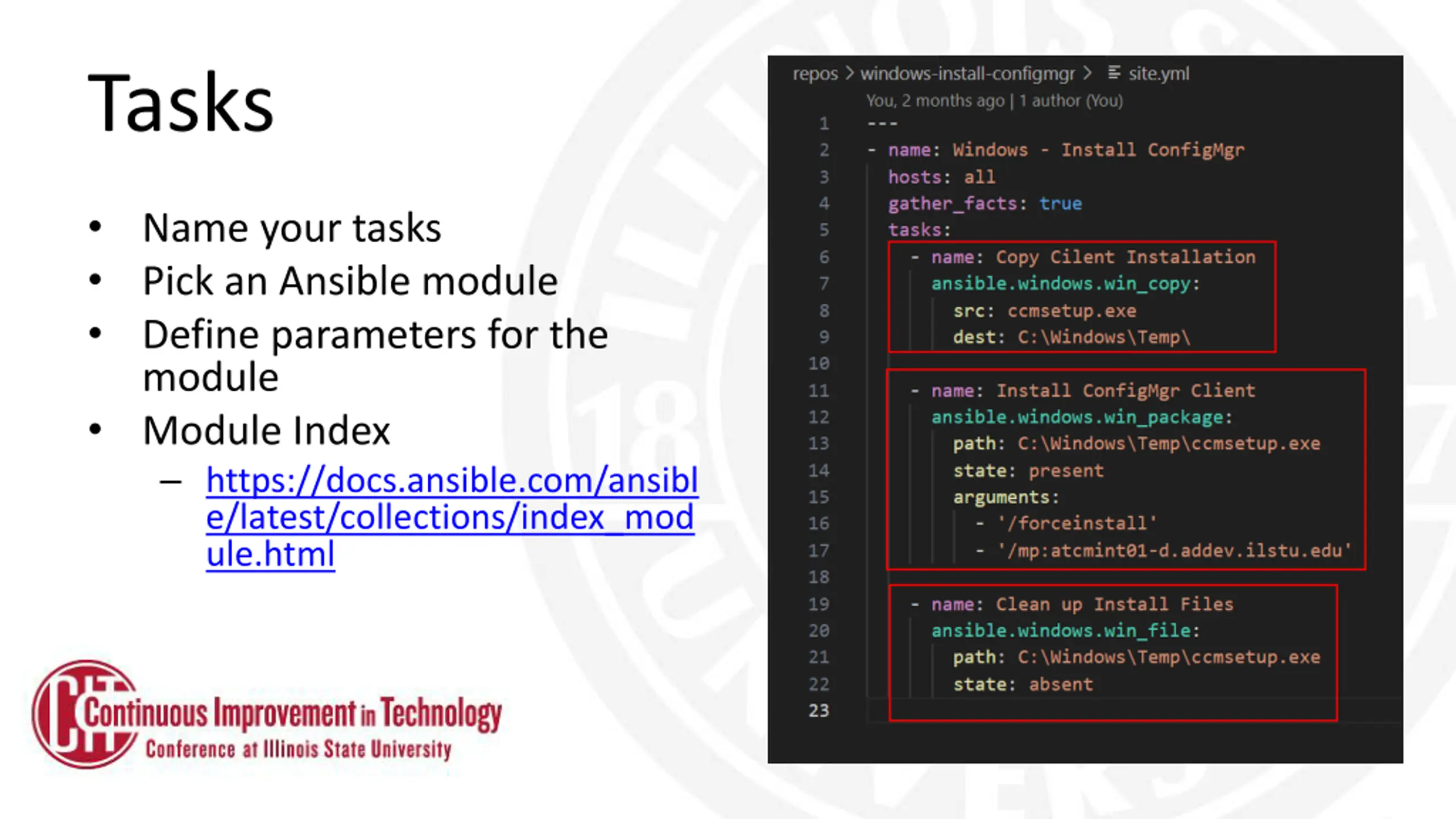 Tasks Name your tasks Pick an Ansible module Define parameters for the module Module Index https://docs.ansible.com/ansibl e/latest/collections/index_mod ule.html