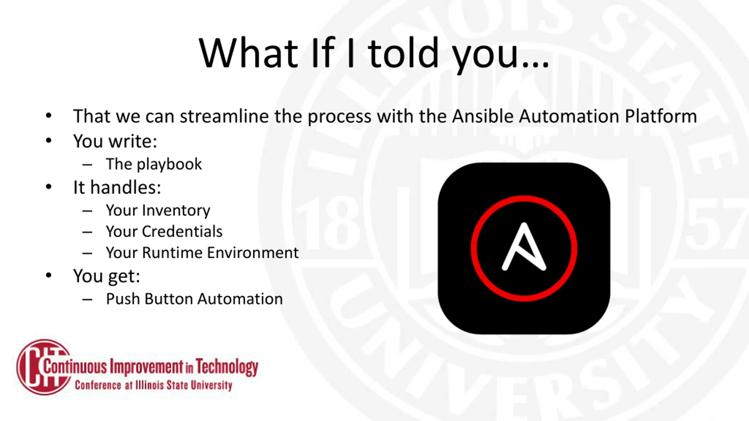 What If I told you That we can streamline the process with the Ansible Automation Platform You write: The playbook It handles: Your Inventory Your Credentials Your Runtime Environment You get: Push Button Automation