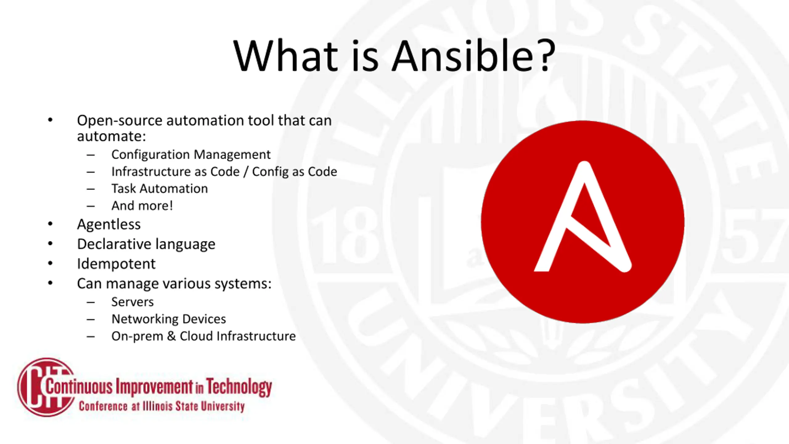 What is Ansible? Open-source automation tool that can automate: Configuration Management Infrastructure as Code / Config as Code Task Automation And more! Agentless Declarative language Idempotent Can manage various systems: Servers Networking Devices On-prem & Cloud Infrastructure
