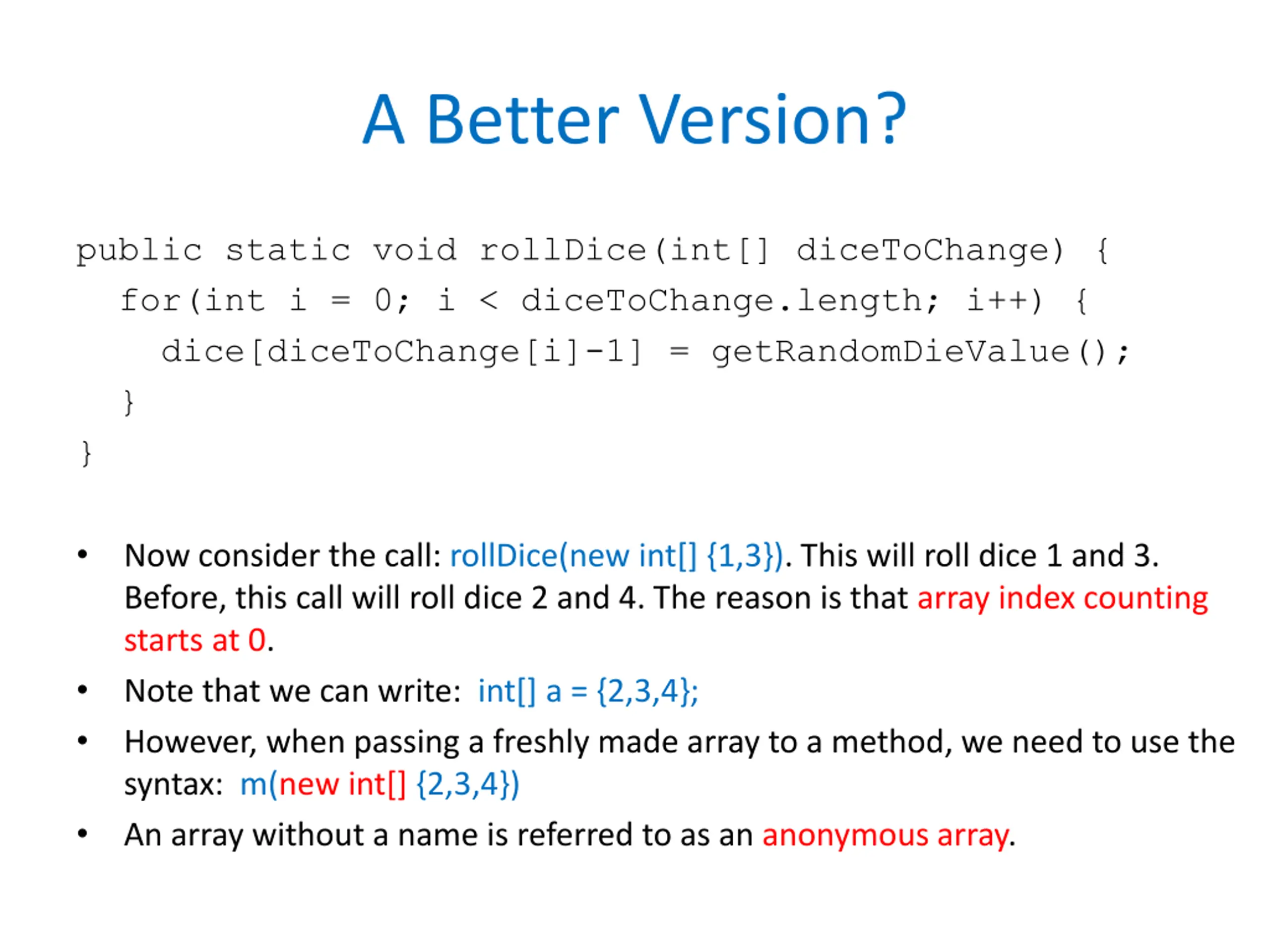 A Better Version? public static void rollDice(int[] diceToChange) { for(int i = 0; i < diceToChange.length; i++) { dice[diceToChange[i]-1] = getRandomDieValue(); } } Now consider the call: rollDice(new int[] {1,3}). This will roll dice 1 and 3. Before, this call will roll dice 2 and 4. The reason is that array index counting starts at 0. Note that we can write: int[] a = {2,3,4}; However, when passing a freshly made array to a method, we need to use the syntax: m(new int[] {2,3,4}) An array without a name is referred to as an anonymous array.