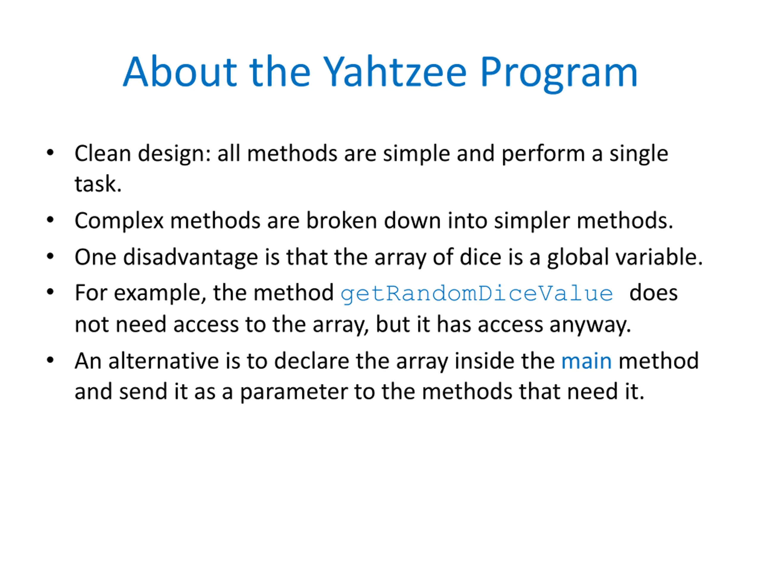 About the Yahtzee Program Clean design: all methods are simple and perform a single task. Complex methods are broken down into simpler methods. One disadvantage is that the array of dice is a global variable. For example, the method getRandomDiceValue does not need access to the array, but it has access anyway. An alternative is to declare the array inside the main method and send it as a parameter to the methods that need it.