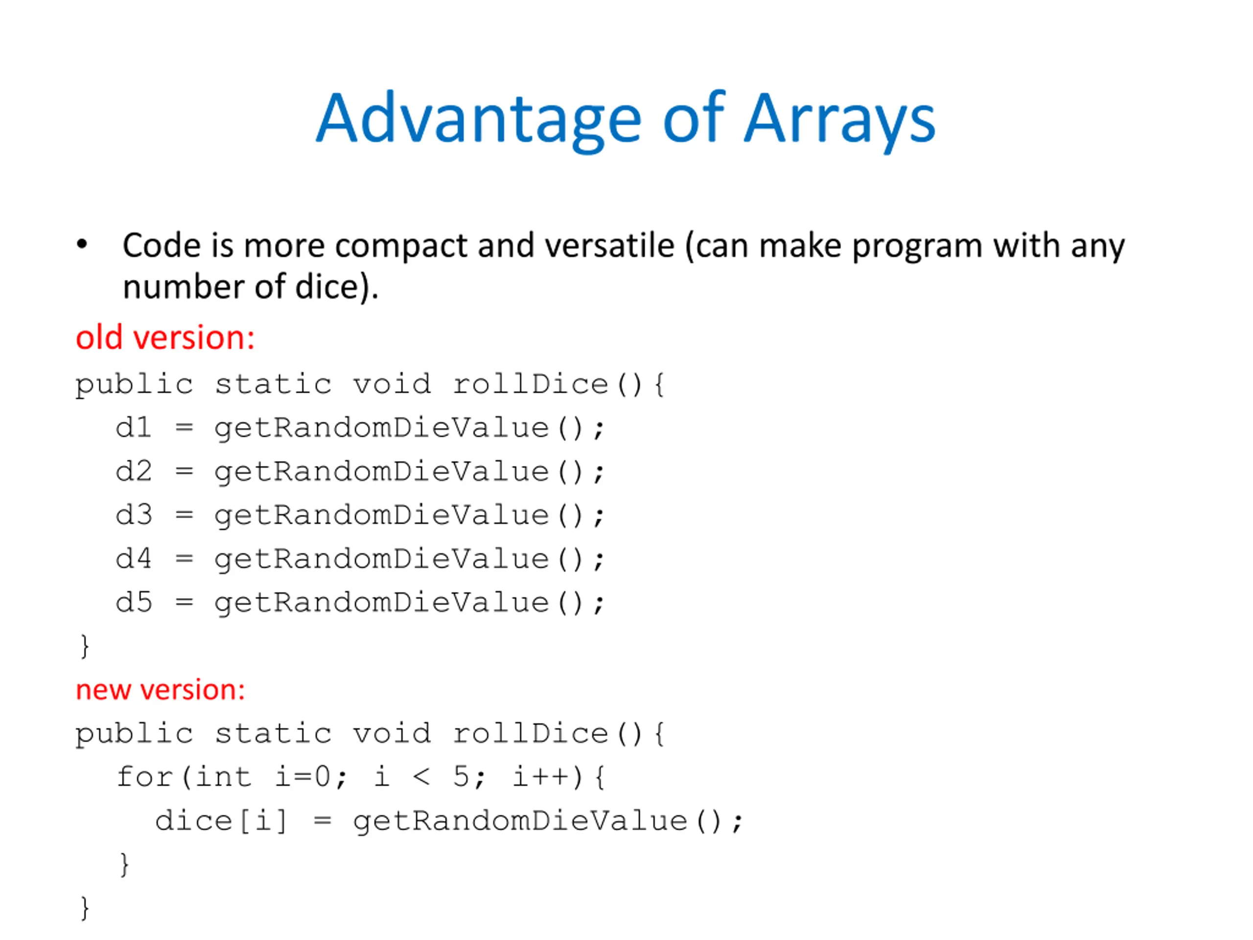 Advantage of Arrays Code is more compact and versatile (can make program with any number of dice). old version: public static void rollDice(){ d1 = getRandomDieValue(); d2 = getRandomDieValue(); d3 = getRandomDieValue(); d4 = getRandomDieValue(); d5 = getRandomDieValue(); } new version: public static void rollDice(){ for(int i=0; i < 5; i++){ dice[i] = getRandomDieValue(); } }