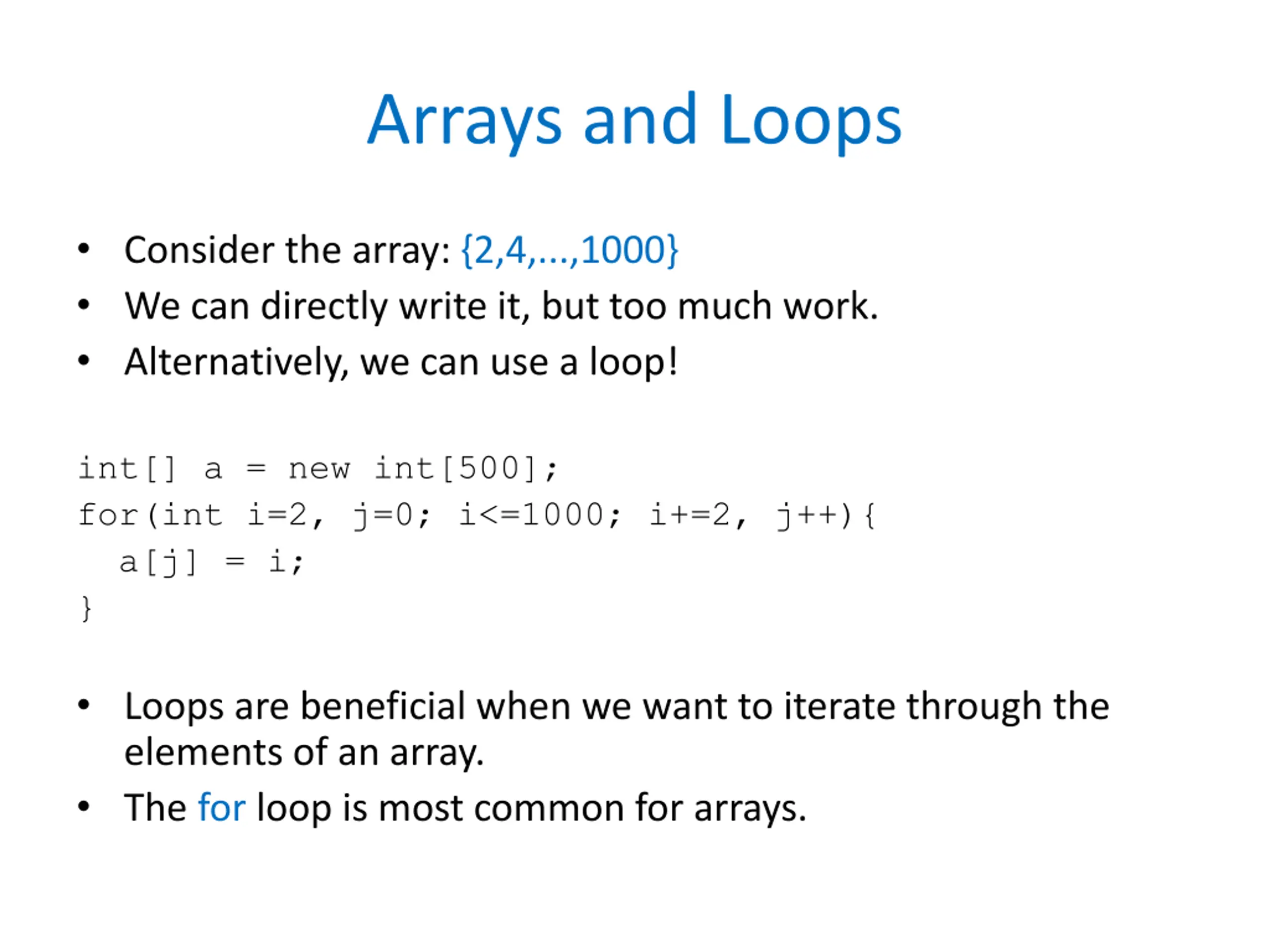 Arrays and Loops Consider the array: {2,4,...,1000} We can directly write it, but too much work. Alternatively, we can use a loop! int[] a = new int[500]; for(int i=2, j=0; i<=1000; i+=2, j++){ a[j] = i; } Loops are beneficial when we want to iterate through the elements of an array. The for loop is most common for arrays.