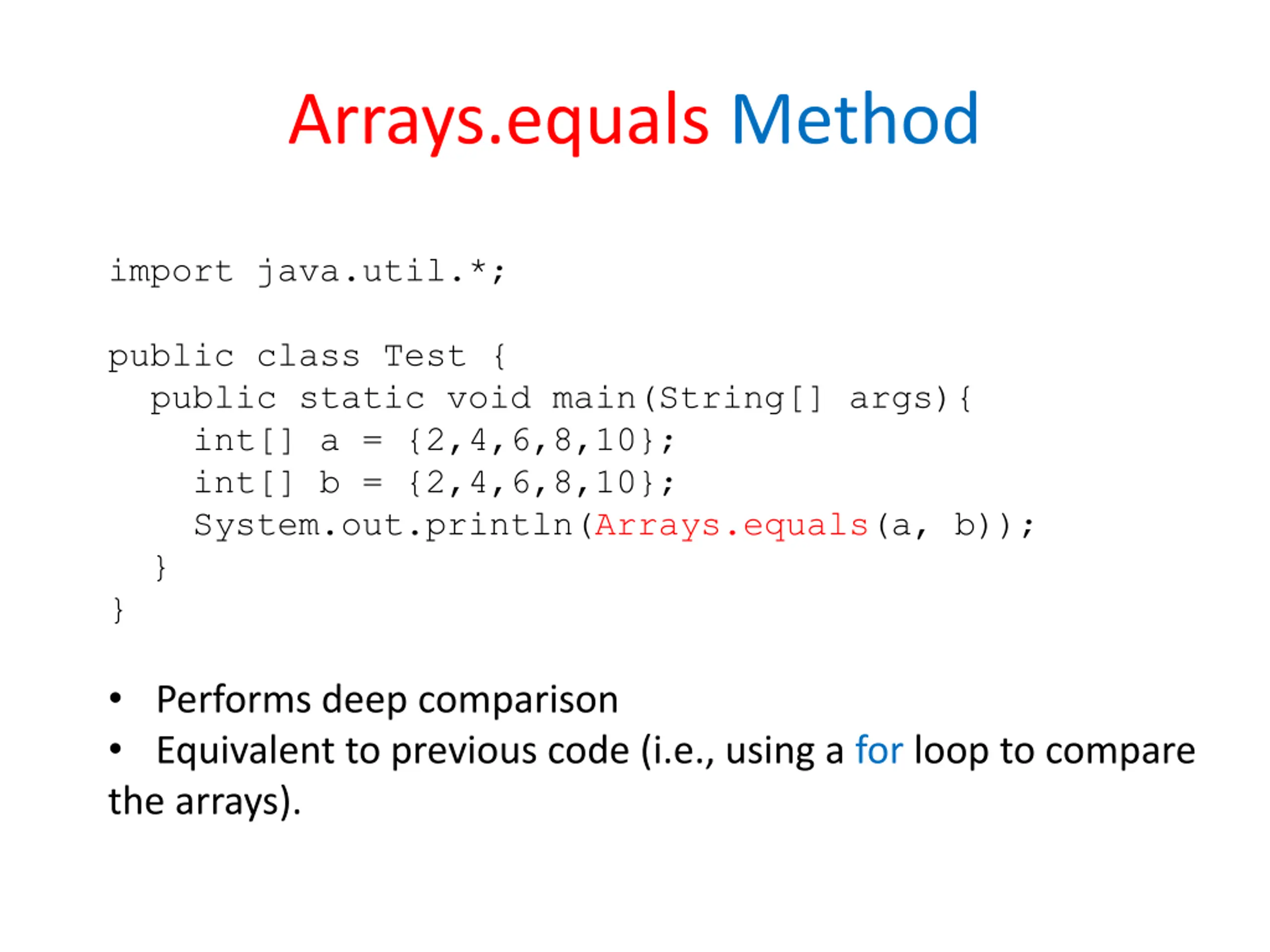 Arrays.equals Method import java.util.*; public class Test { public static void main(String[] args){ int[] a = {2,4,6,8,10}; int[] b = {2,4,6,8,10}; System.out.println(Arrays.equals(a, b)); } } Performs deep comparison Equivalent to previous code (i.e., using a for loop to compare the arrays).