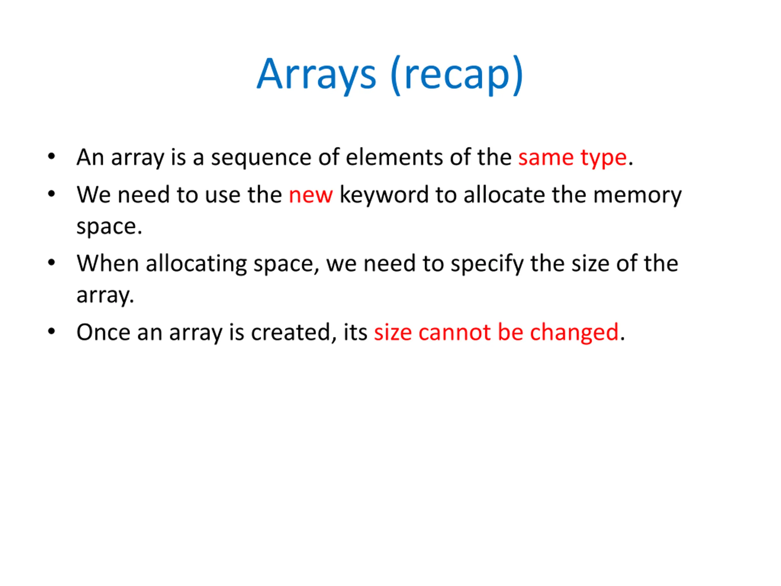 Arrays (recap) An array is a sequence of elements of the same type. We need to use the new keyword to allocate the memory space. When allocating space, we need to specify the size of the array. Once an array is created, its size cannot be changed.