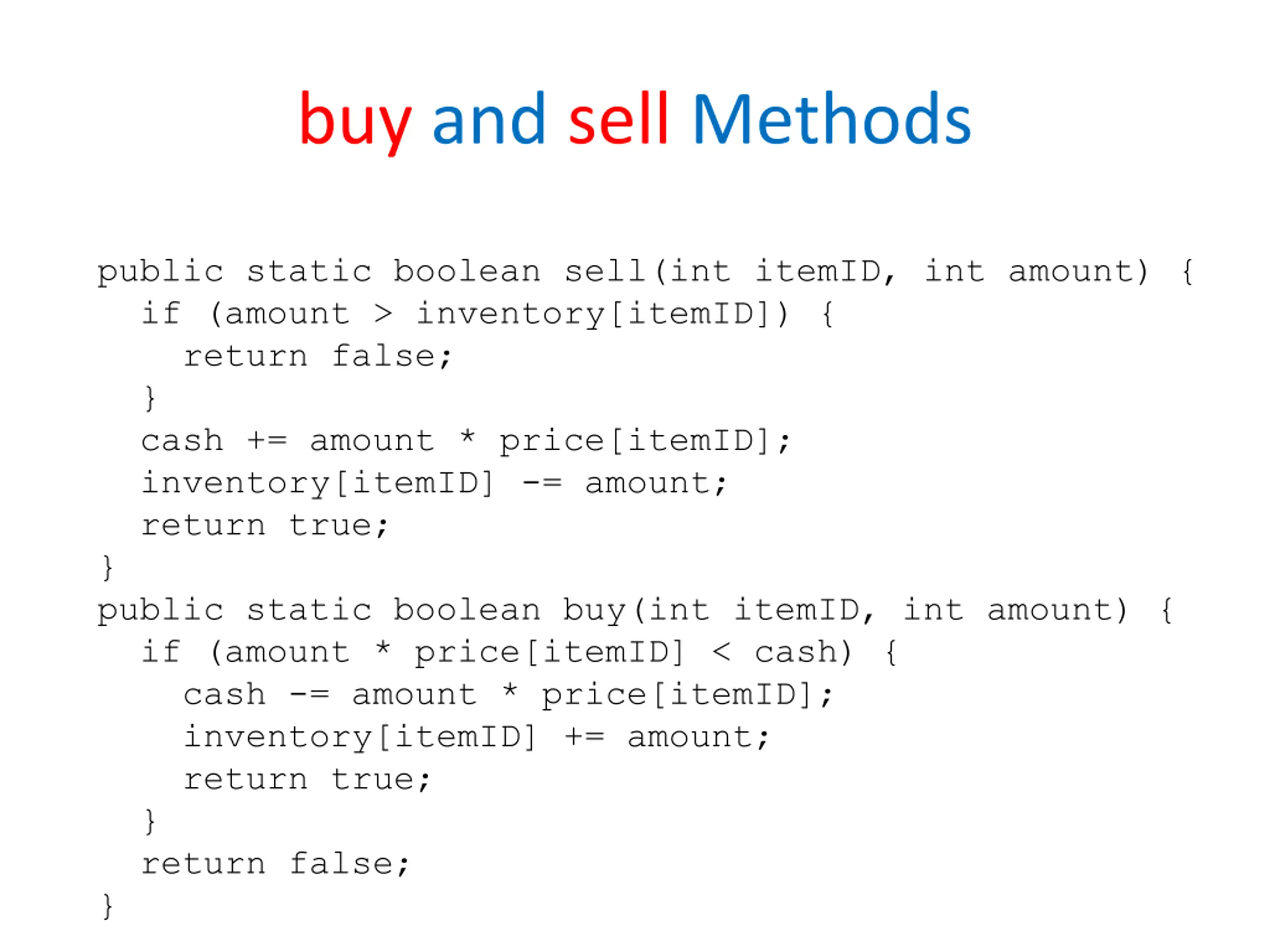 buy and sell Methods public static boolean sell(int itemID, int amount) { if (amount > inventory[itemID]) { return false; } cash += amount * price[itemID]; inventory[itemID] -= amount; return true; } public static boolean buy(int itemID, int amount) { if (amount * price[itemID] < cash) { cash -= amount * price[itemID]; inventory[itemID] += amount; return true; } return false; }