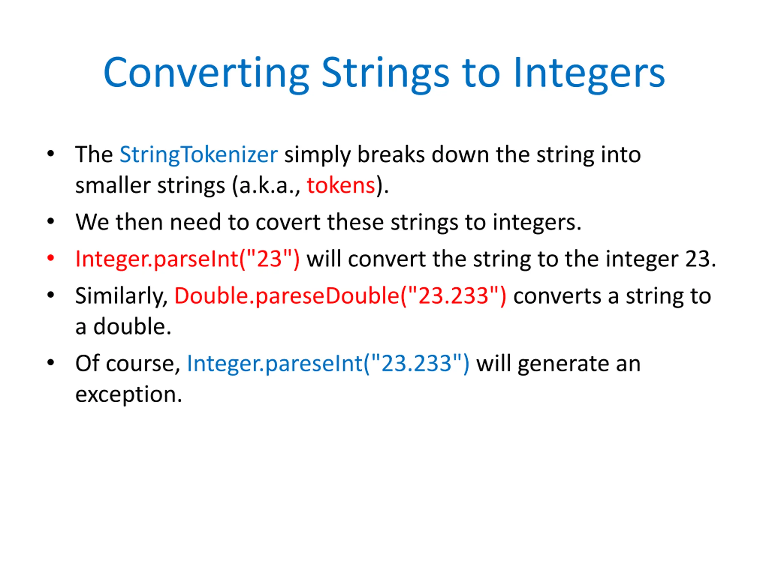 Converting Strings to Integers The StringTokenizer simply breaks down the string into smaller strings (a.k.a., tokens). We then need to covert these strings to integers. Integer.parseInt("23") will convert the string to the integer 23. Similarly, Double.pareseDouble("23.233") converts a string to a double. Of course, Integer.pareseInt("23.233") will generate an exception.
