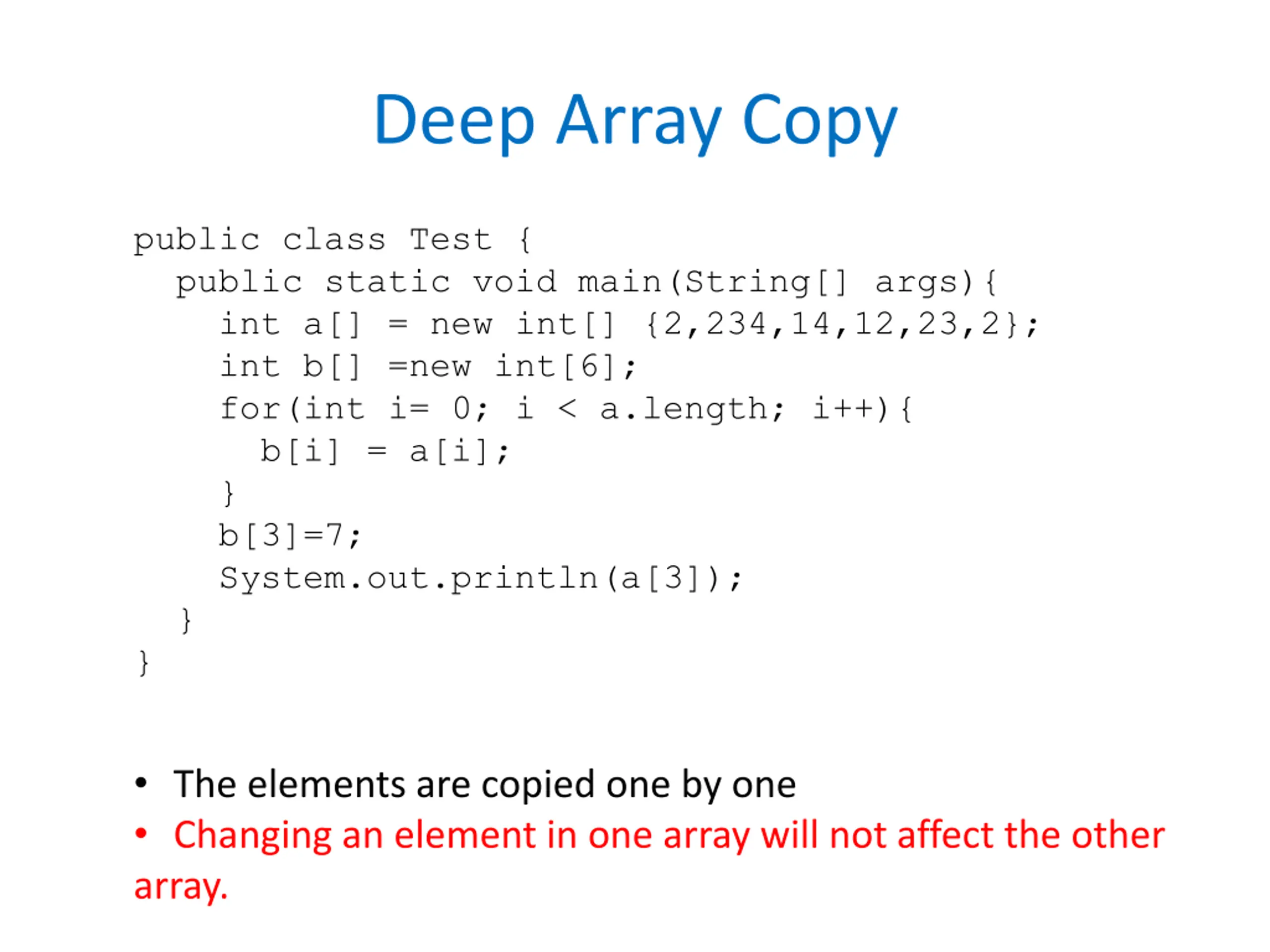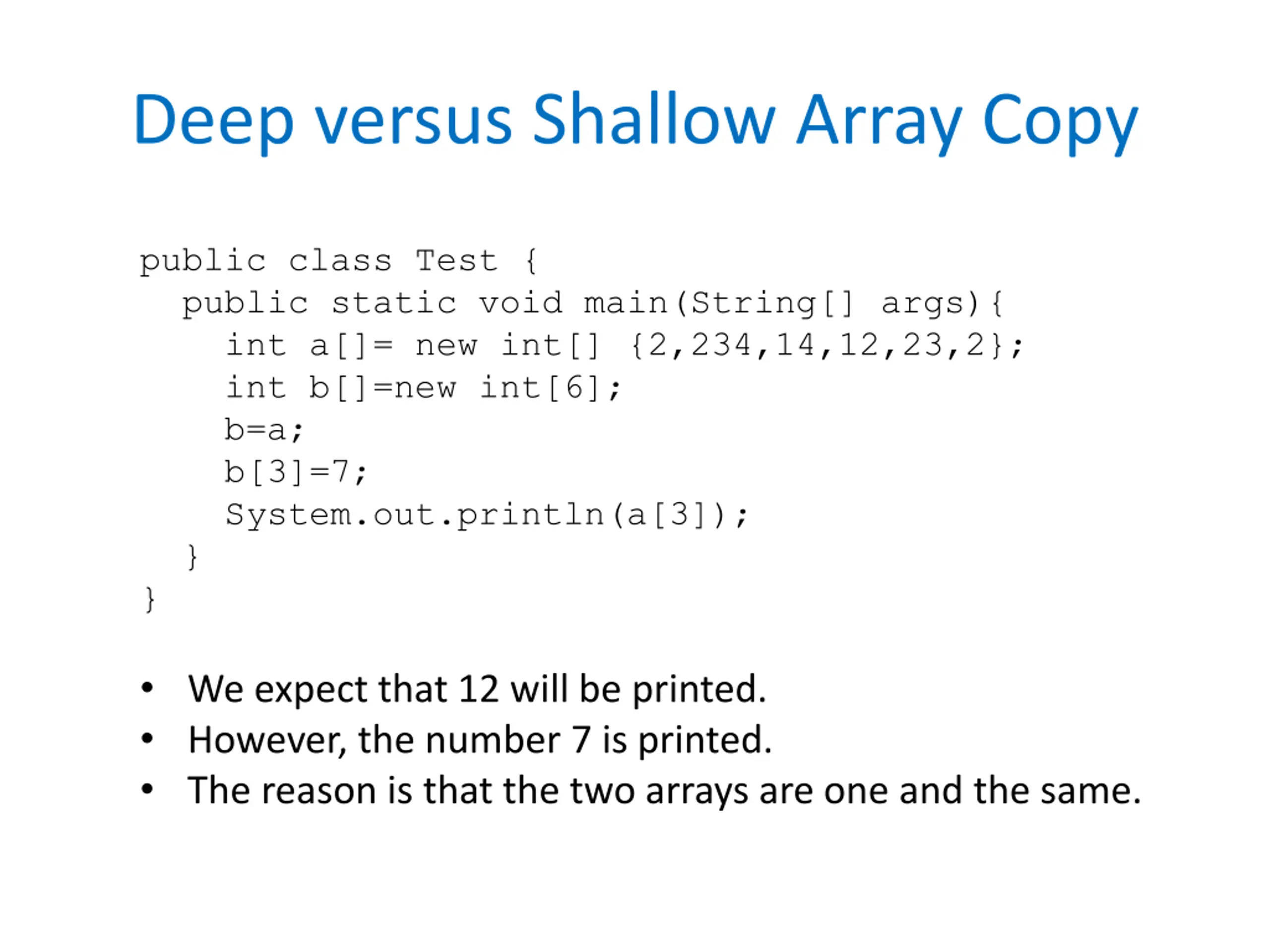 Deep versus Shallow Array Copy public class Test { public static void main(String[] args){ int a[]= new int[] {2,234,14,12,23,2}; int b[]=new int[6]; b=a; b[3]=7; System.out.println(a[3]); } } We expect that 12 will be printed. However, the number 7 is printed. The reason is that the two arrays are one and the same.