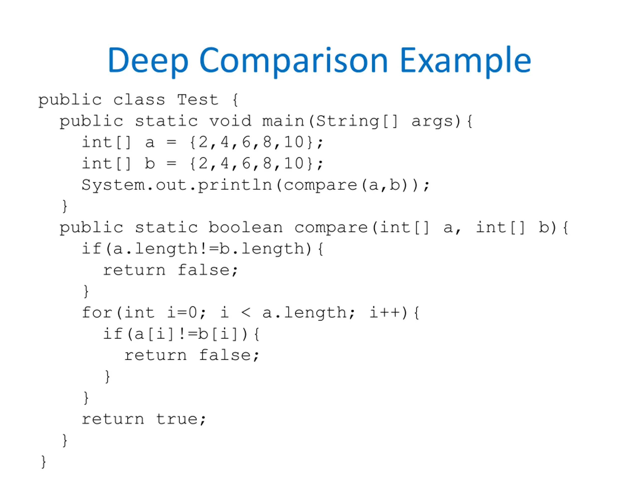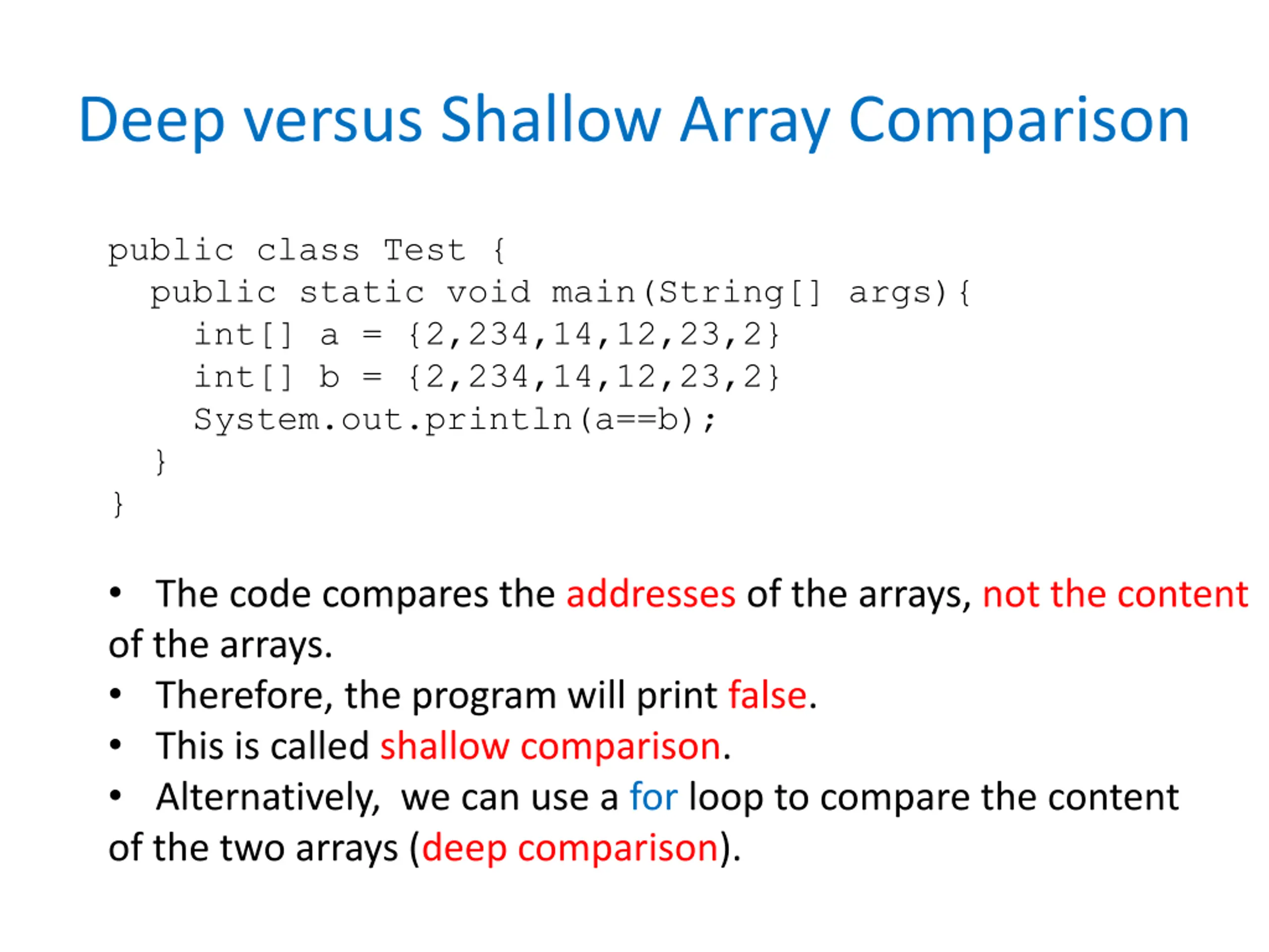 Deep versus Shallow Array Comparison public class Test { public static void main(String[] args){ int[] a = {2,234,14,12,23,2} int[] b = {2,234,14,12,23,2} System.out.println(a==b); } } The code compares the addresses of the arrays, not the content of the arrays. Therefore, the program will print false. This is called shallow comparison. Alternatively, we can use a for loop to compare the content of the two arrays (deep comparison).