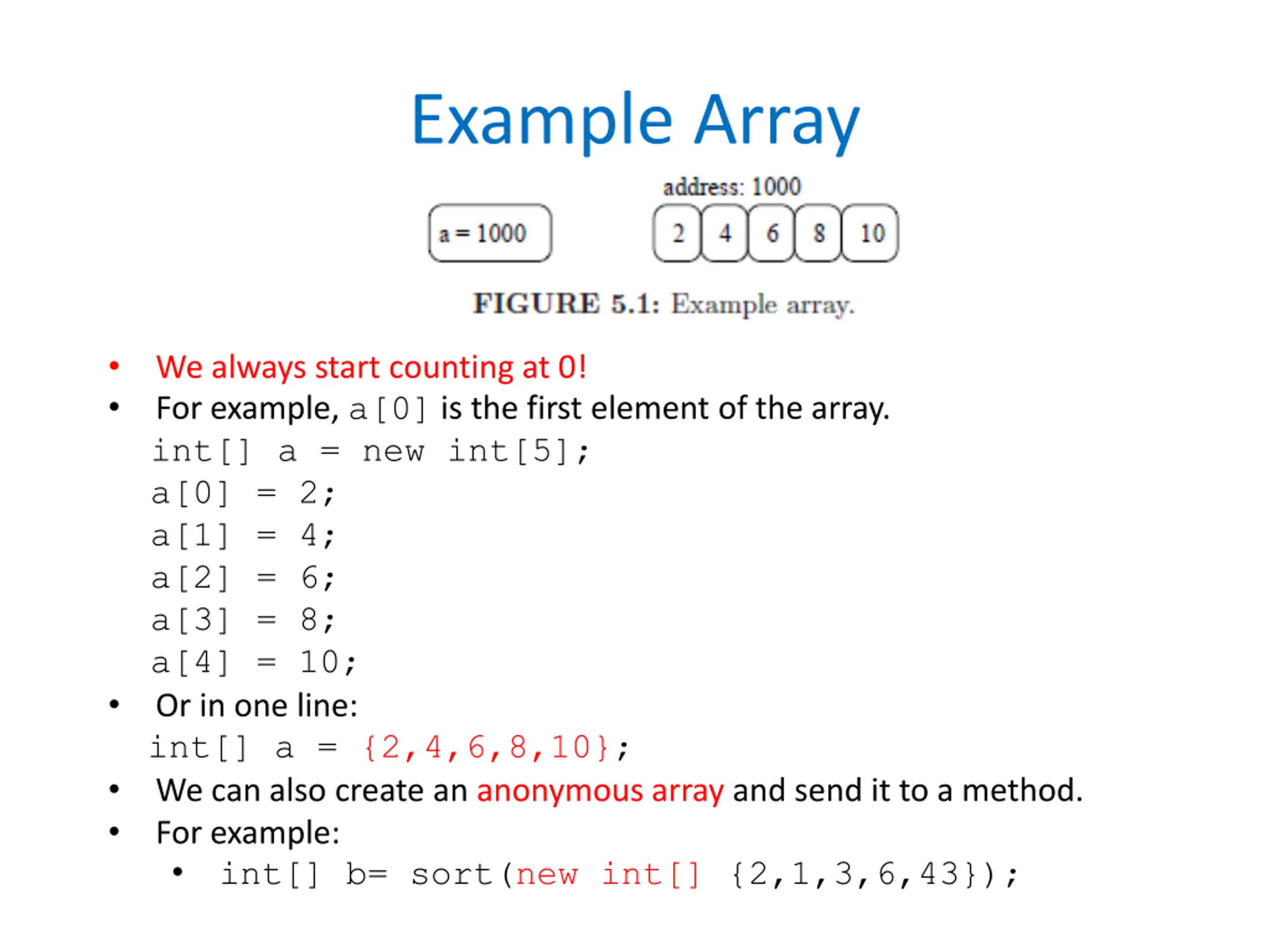 Example Array int[] a = new int[5]; a[0] = 2; a[1] = 4; a[2] = 6; a[3] = 8; a[4] = 10; Or in one line: int[] a = {2,4,6,8,10}; We can also create an anonymous array and send it to a method. For example: int[] b= sort(new int[] {2,1,3,6,43}); We always start counting at 0! For example, a[0] is the first element of the array.