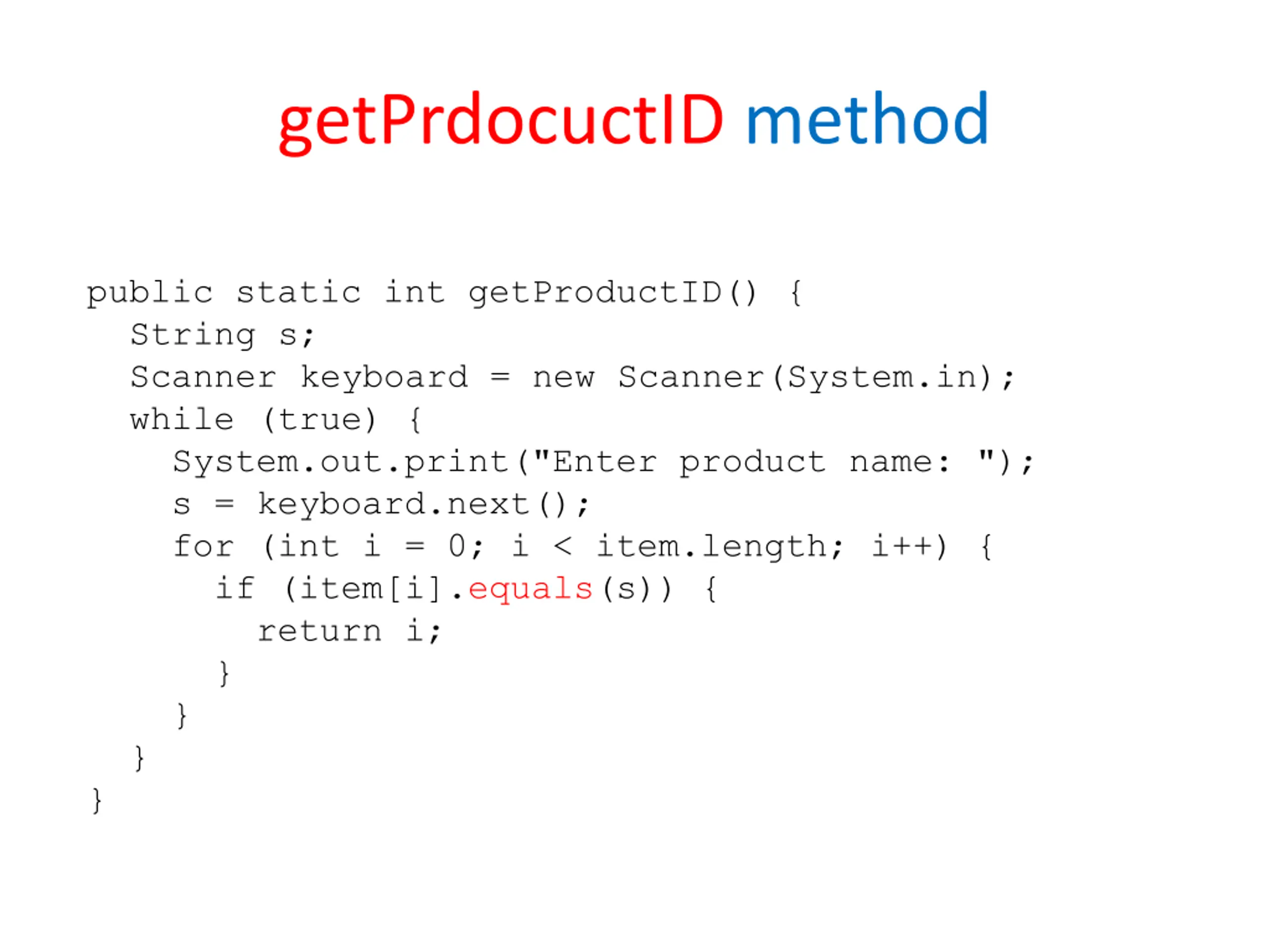 getPrdocuctID method public static int getProductID() { String s; Scanner keyboard = new Scanner(System.in); while (true) { System.out.print("Enter product name: "); s = keyboard.next(); for (int i = 0; i < item.length; i++) { if (item[i].equals(s)) { return i; } } } }