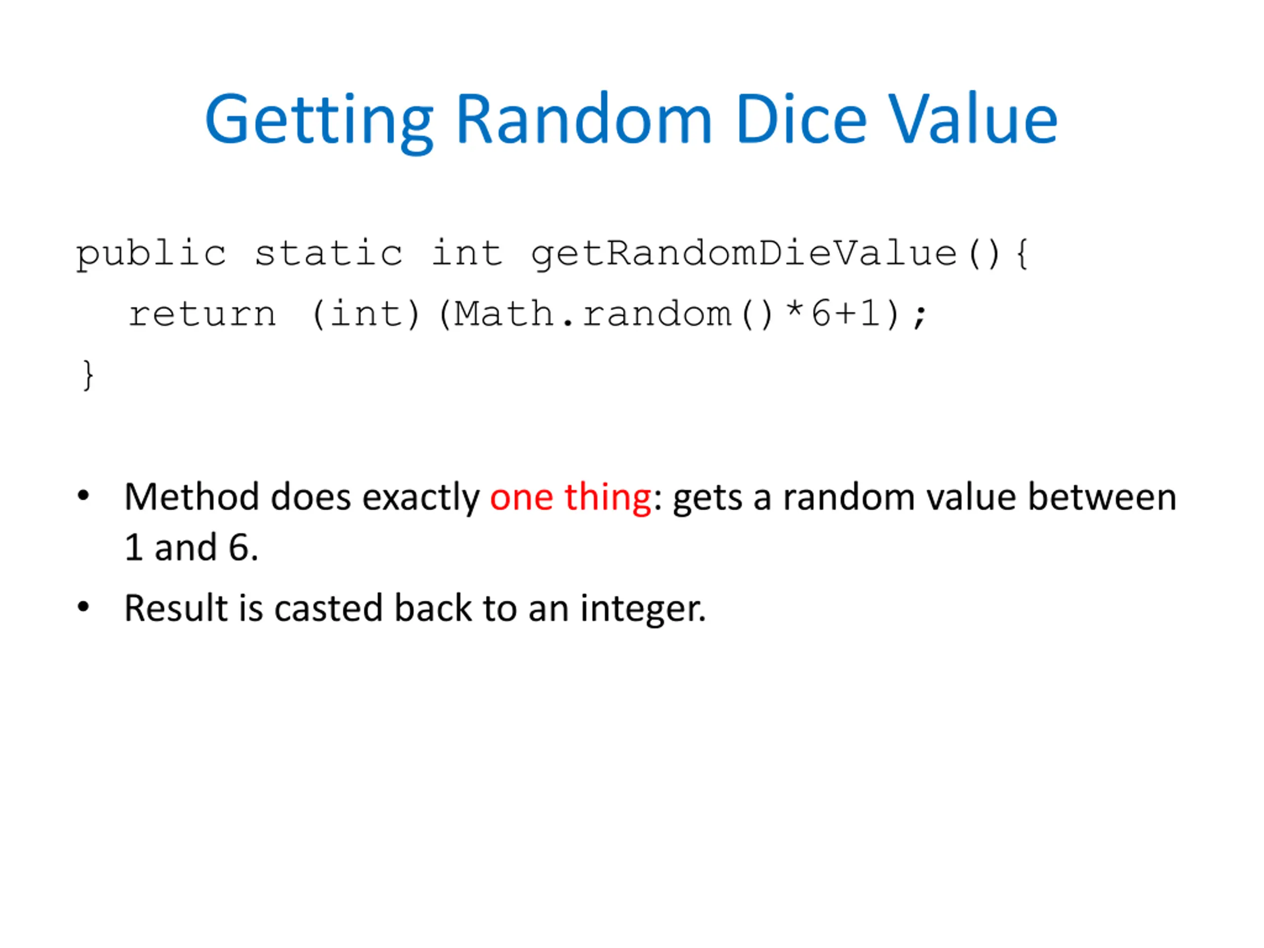 Getting Random Dice Value public static int getRandomDieValue(){ return (int)(Math.random()*6+1); } Method does exactly one thing: gets a random value between 1 and 6. Result is casted back to an integer.