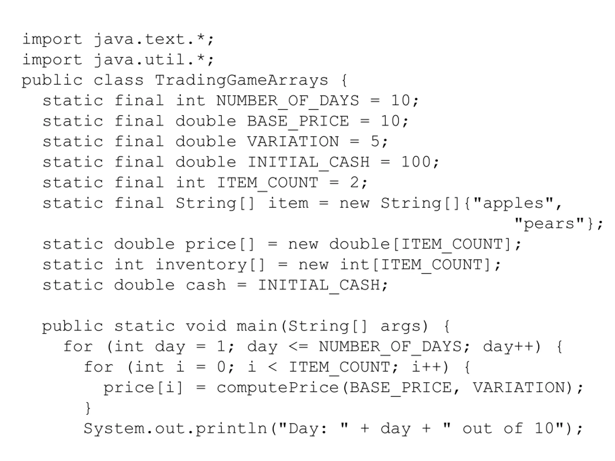 import java.text.*; import java.util.*; public class TradingGameArrays { static final int NUMBER_OF_DAYS = 10; static final double BASE_PRICE = 10; static final double VARIATION = 5; static final double INITIAL_CASH = 100; static final int ITEM_COUNT = 2; static final String[] item = new String[]{"apples", static double price[] = new double[ITEM_COUNT]; static int inventory[] = new int[ITEM_COUNT]; static double cash = INITIAL_CASH; "pears"}; public static void main(String[] args) { for (int day = 1; day <= NUMBER_OF_DAYS; day++) { for (int i = 0; i < ITEM_COUNT; i++) { price[i] = computePrice(BASE_PRICE, VARIATION); } System.out.println("Day: " + day + " out of 10");