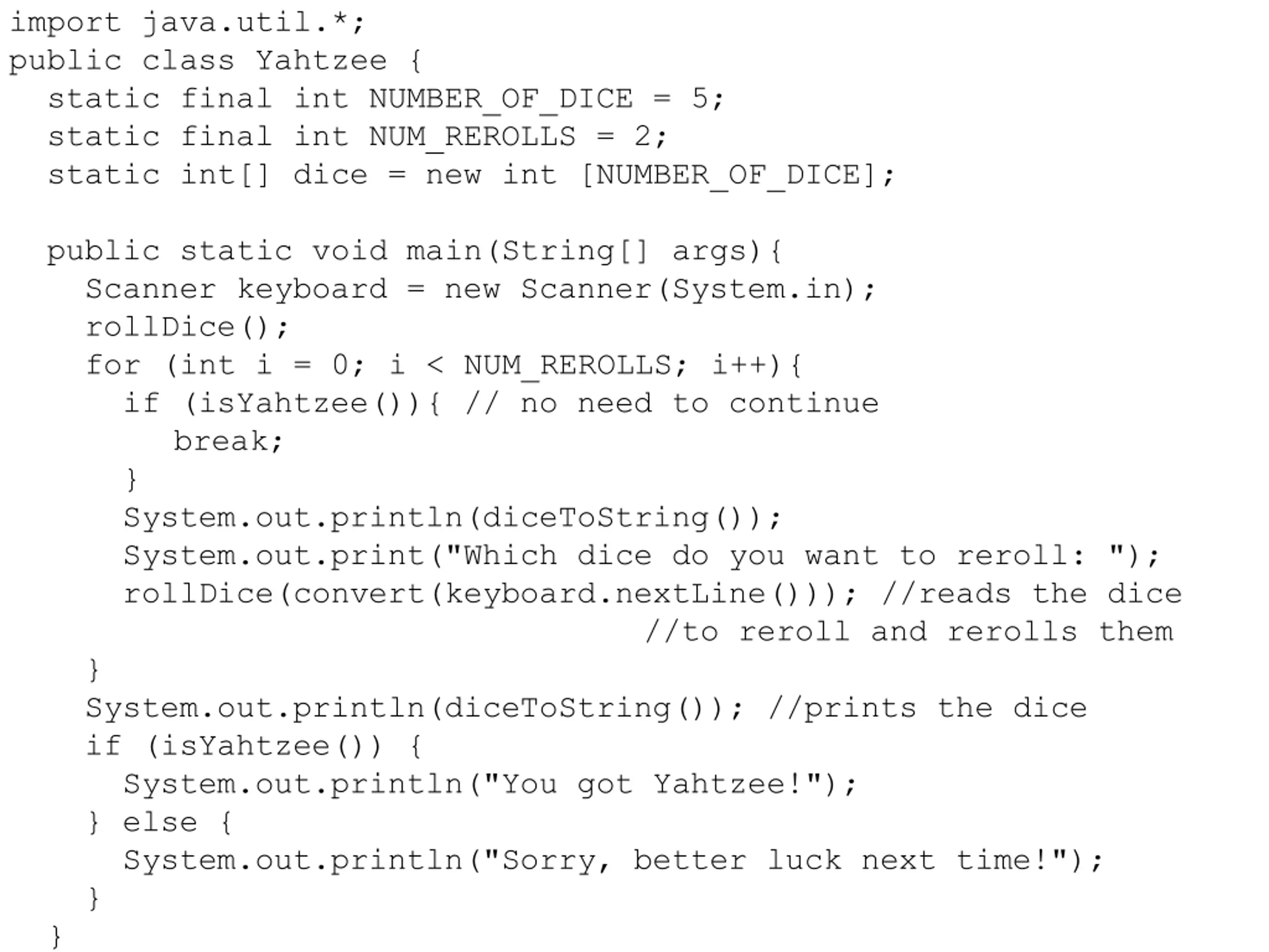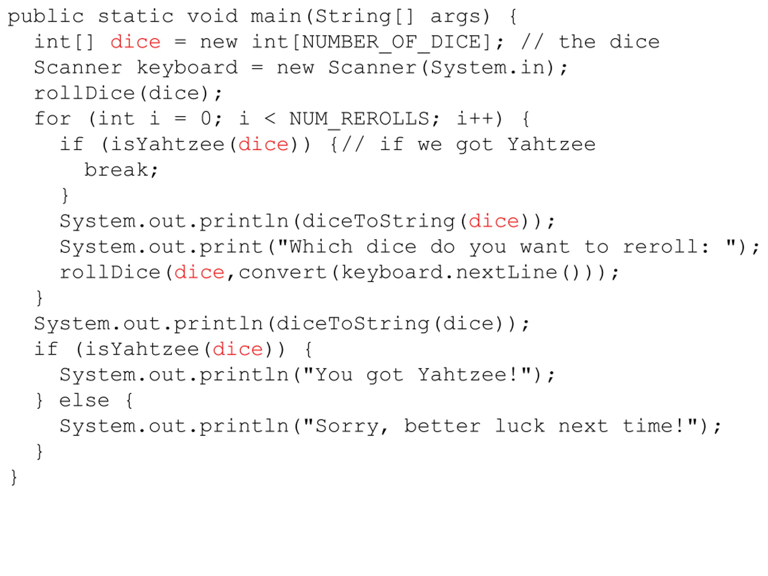 public static void main(String[] args) { int[] dice = new int[NUMBER_OF_DICE]; // the dice Scanner keyboard = new Scanner(System.in); rollDice(dice); for (int i = 0; i < NUM_REROLLS; i++) { if (isYahtzee(dice)) {// if we got Yahtzee break; } System.out.println(diceToString(dice)); System.out.print("Which dice do you want to reroll: "); rollDice(dice,convert(keyboard.nextLine())); } System.out.println(diceToString(dice)); if (isYahtzee(dice)) { System.out.println("You got Yahtzee!"); } else { System.out.println("Sorry, better luck next time!"); } }