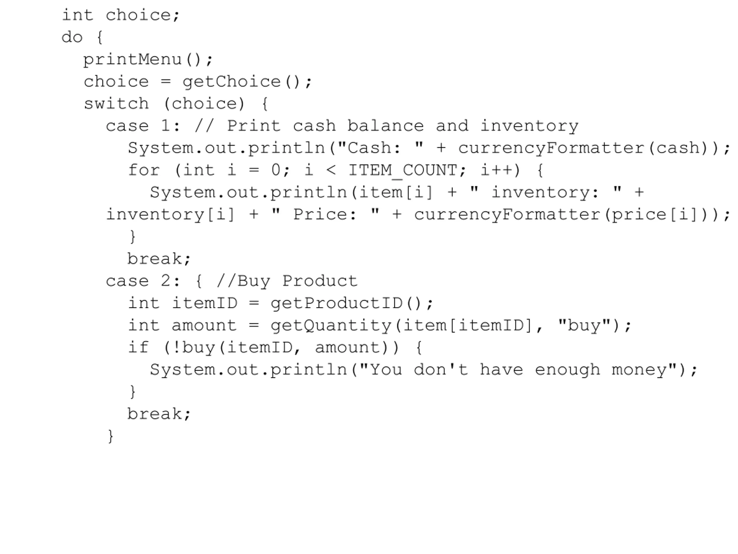int choice; do { printMenu(); choice = getChoice(); switch (choice) { case 1: // Print cash balance and inventory System.out.println("Cash: " + currencyFormatter(cash)); for (int i = 0; i < ITEM_COUNT; i++) { System.out.println(item[i] + " inventory: " + inventory[i] + " Price: " + currencyFormatter(price[i])); } break; case 2: { //Buy Product int itemID = getProductID(); int amount = getQuantity(item[itemID], "buy"); if (!buy(itemID, amount)) { System.out.println("You don't have enough money"); } break; }