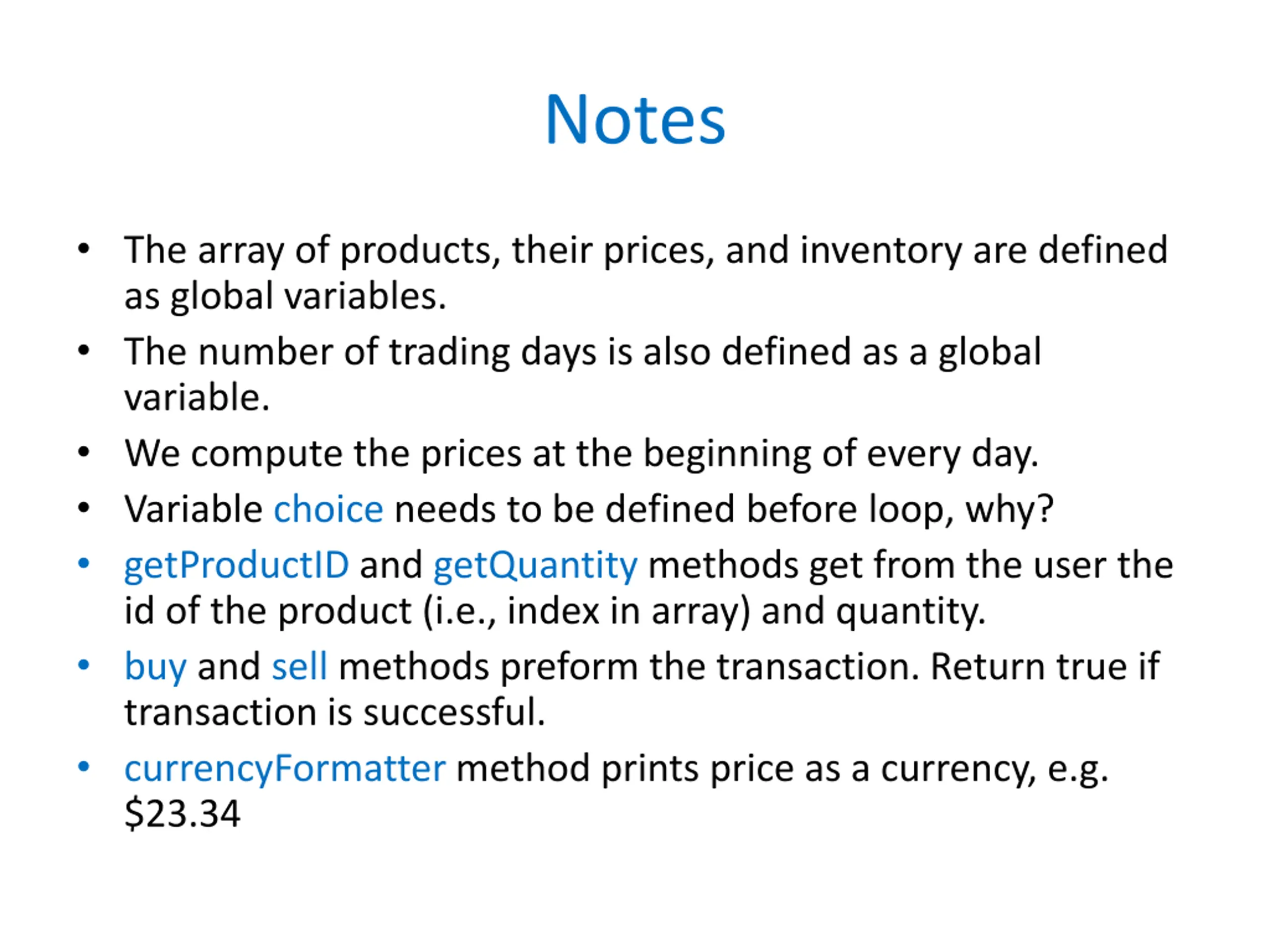 Notes The array of products, their prices, and inventory are defined as global variables. The number of trading days is also defined as a global variable. We compute the prices at the beginning of every day. Variable choice needs to be defined before loop, why? getProductID and getQuantity methods get from the user the id of the product (i.e., index in array) and quantity. buy and sell methods preform the transaction. Return true if transaction is successful. currencyFormatter method prints price as a currency, e.g. $23.34