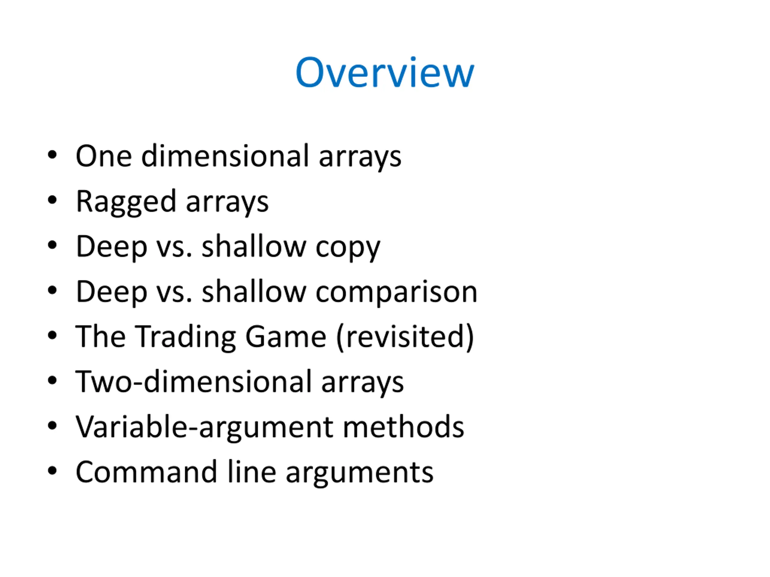 Overview One dimensional arrays Ragged arrays Deep vs. shallow copy Deep vs. shallow comparison The Trading Game (revisited) Two-dimensional arrays Variable-argument methods Command line arguments